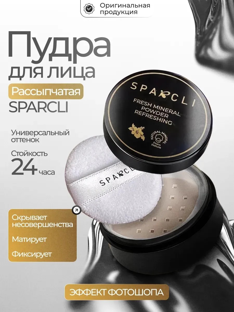 Минеральная рассыпчатая пудра Sparcli матирует и маскирует красноту кожи, выравнивает ее цвет, позволяет избавиться от следов усталости.Она компактная и имеет чистый гипоаллергенный состав без талька, хорошо фиксирует макияж и убирает жирный блеск Её можно применять после пластических операций, а также после косметологических процедур.