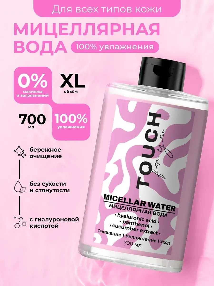 Мицеллярная вода Touch for you – это эффективное и бережное средство для снятия макияжа, подходящее для всех типов кожи. Ее уникальная формула, обогащенная гиалуроновой кислотой, обеспечивает деликатное очищение, удаляя даже стойкий макияж без раздражения. Вода эффективно растворяет загрязнения и остатки косметики, оставляя кожу чистой, увлажненной и мягкой. Благодаря комплексу увлажняющих сахаров и экстракту огурца, мицеллярная вода не только очищает, но и питает кожу, придает ей свежесть и сияние. Объем флакона 700 мл обеспечивает длительное использование, делая Touchforyou идеальным выбором для ежедневного ухода за кожей.