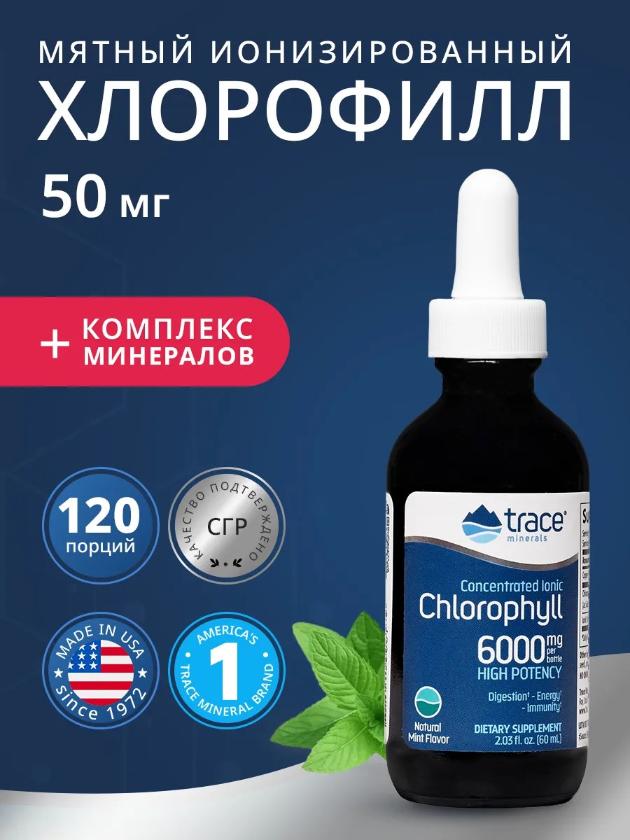 Trace Minerals' mint-flavored ionic liquid chlorophyll supports gastrointestinal function, normalizes microflora, and eliminates bad breath; it cleanses the body and promotes weight loss; improves skin quality and eliminates unpleasant body odors.