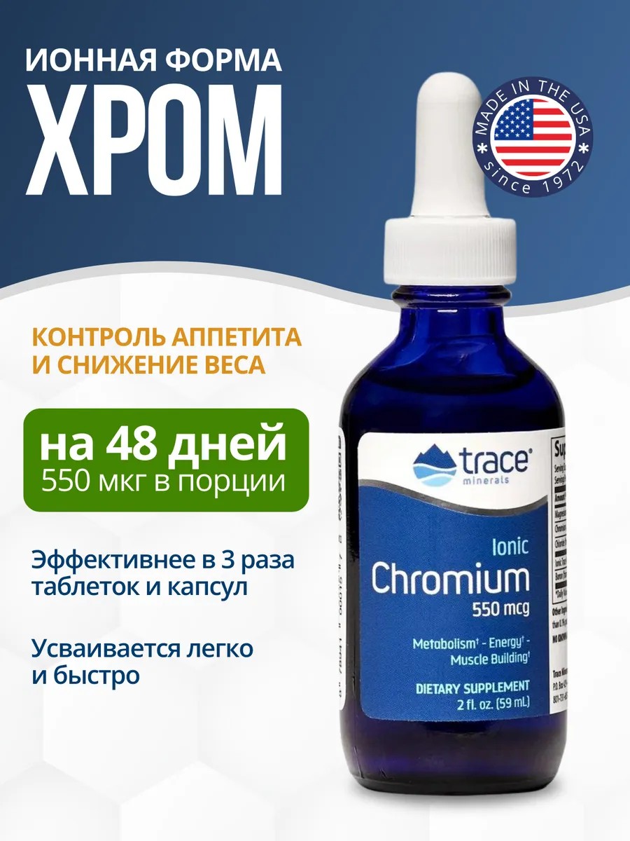 Chromium 550 mcg Trace Minerals is produced in an ionic, bioavailable form for maximum absorption by the body. There are different forms: chromium picolinate, chromium chelate, but ionic chromium has the highest absorption rate. Chromium is effective for weight loss for both men and women.