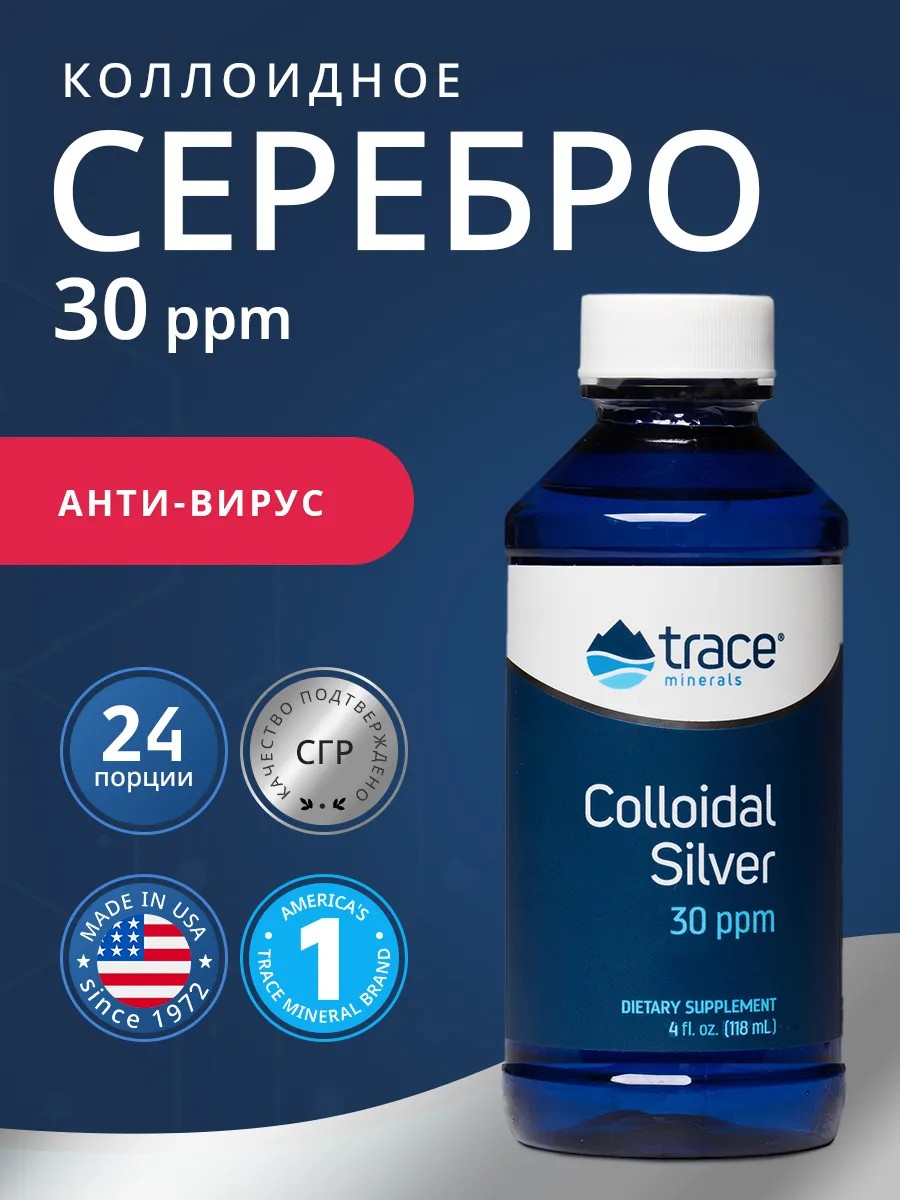 Коллоидное серебро Trace Minerals - природный антибиотик, который укрепляет иммунитет, эффективен против вирусов и против инфекций. Коллоидное серебро питьевое содержит более 30 частей на миллион чистого, насыщенно-окисленного коллоидного серебра 99,999% в каждой порции. Серебряная вода создает среду, в которой патогенные микробы не могут существовать и размножаться. Являясь противогрибковым и противовирусным средством, серебро БАД рекомендуется для иммунитета взрослым любого возраста. Colloidal Silver 30ppm Trace Minerals действует как детокс для организма, способствует выведению вредных веществ и токсинов. Коллоид помогает избавиться от чувства голода, улучшает метаболизм и снабжает организм необходимыми питательными веществами. Коллоидное серебро для детей рекомендовано в возрасте от 4х лет.