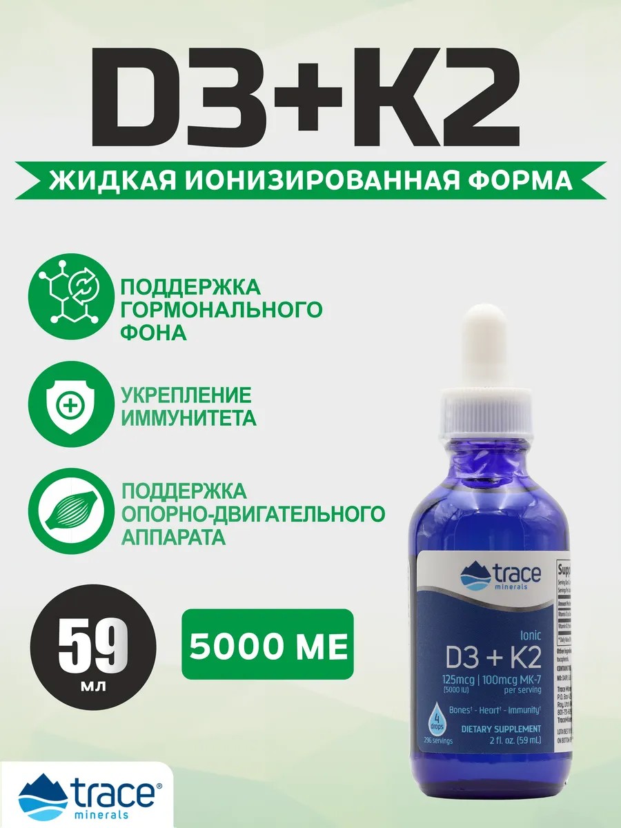 Trace Minerals Ionic D3+K2 (59 мл) — Ваш Партнер в Поддержке Здоровья Костей и Иммунной СистемыОткройте для себя преимущества Trace Minerals Ionic D3+K2 — мощного комплекса, который обеспечивает необходимыми витаминами D3 и K2 для оптимального здоровья. В каждой бутылке содержится 59 мл уникальной формулы, разработанной для поддержания костной и сердечно-сосудистой систем, а также для укрепления иммунитета.Ключевые преимущества Trace Minerals Ionic D3+K2:- Усиливает поглощение кальция: Витамин D3 способствует усвоению кальция в организме, что делает этот продукт идеальным для поддержания крепких костей и зубов. Витамин K2 работает в синергии с D3, помогая направить кальций в нужные места.- Поддержка иммунной системы: Витамин D3 играет важную роль в поддержании иммунных функций, обеспечивая защиту организма от различных инфекций и заболеваний.- Легкость применения: Жидкая форма и удобная капельница позволяют легко дозировать средство и добавлять его в воду, сок или другие напитки, что делает использование простым и приятным.- Натуральные ингредиенты: Этот продукт не содержит искусственных добавок, красителей и консервантов, что обеспечивает его безопасность и высокое качество.Рекомендуется принимать 1 мерную ложку (5 мл) в день, запивая водой или соком, для достижения наилучших результатов.С Trace Minerals Ionic D3+K2 вы получаете надежного помощника для поддержания своего здоровья. Обеспечьте оптимальный уровень витаминов в своем организме для крепких костей и активной жизни. Сделайте этот продукт частью своего ежедневного рациона и почувствуйте разницу!