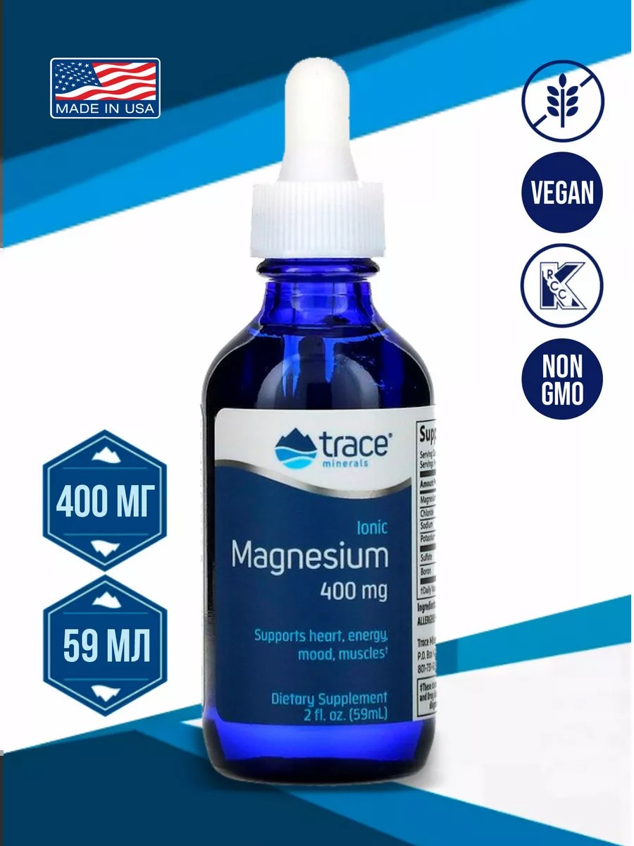 Trace Minerals Ionic Magnesium (ионный магний) 400 mg, 59 мл – биологически активная добавка, содержащая магний в ионной форме. Она позволяет лучшему усваиванию минерала в организме для поддержания здоровья сердца, нервной системы и мышечной ткани.