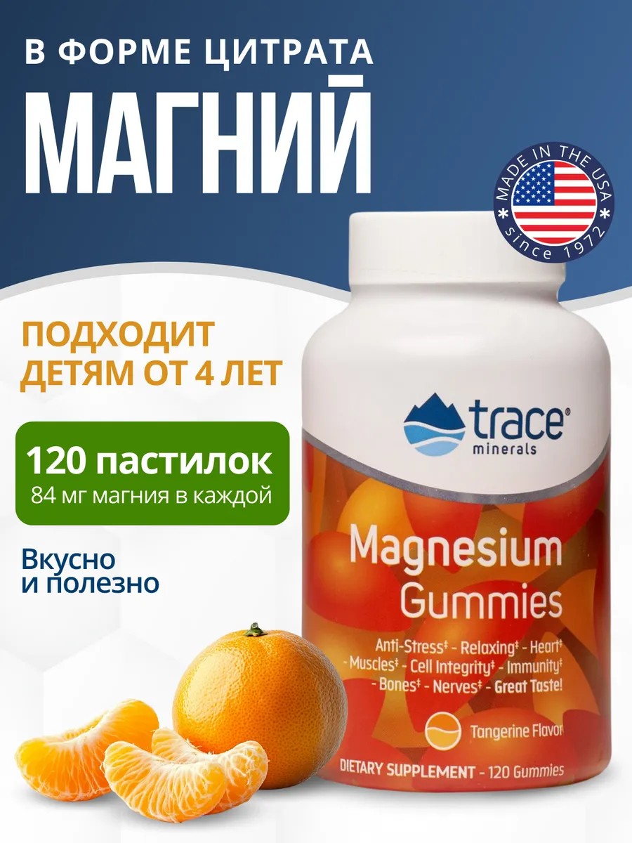 Магний цитрат жевательный Trce Minerals со вкусом мандарина рекомендован для школьников и для подростков. В периоды повышенного стресса или напряжённой физической активности цитрат магния жевательный необходим для организма. Магний детский стабилизирует психоэмоциональное состояние. Магний цитрат для детей снижает гиперактивность и улучшает сон. Magnesium Gummies Trace Minerals стабилизирует работу нервной системы. Магний пастилки помогают правильно сформировать системы организма ребенка в период активного роста. Жевательный магний мармелад рекомендован и для взрослых, позволяя всей семье восполнять дефицит магния в организме. Магний для беременных обладает высокой биодоступностью и легко усваивается. Магний витамины поддерживает здоровье иммунной системы, а также повышает уровень энергии на целый день.