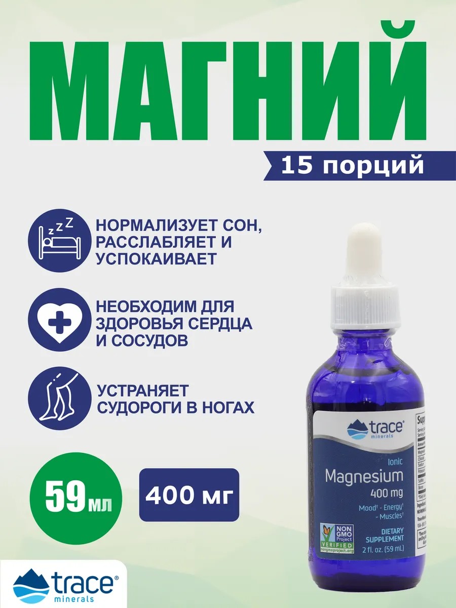 Trace Minerals Liquid Ionic Magnesium 400mg (59 мл) — Эффективная Поддержка Здоровья и РасслабленияОткройте для себя преимущества магния с Trace Minerals Liquid Ionic Magnesium. Объемом 59 мл этот высококачественный жидкий продукт содержит 400 мг магния, который играет ключевую роль в поддержании общего здоровья, расслаблении мышц и улучшении психоэмоционального состояния.Ключевые преимущества Trace Minerals Liquid Ionic Magnesium:- Поддержка нервной системы: Магний необходим для нормального функционирования мозга и нервной системы, помогая снизить уровень стресса и тревожности, а также улучшить качество сна.- Улучшение мышечной релаксации: Идеально подходит для активных людей, данный магний способствует уменьшению мышечного напряжения и спазмов, что облегчает восстановление после тренировок и физической активности.- Высокая биодоступность: Жидкая форма магния обеспечивает быстрое усвоение и эффективность, что делает его более предпочтительным выбором по сравнению с традиционными таблетками и капсулами.- Натуральный и безопасный состав: Без искусственных добавок и консервантов, Trace Minerals Liquid Ionic Magnesium подходит для ежедневного использования в рамках здорового образа жизни.Рекомендуется принимать 1 мерную ложку (5 мл) в день, смешивая с водой или соком для удобства.С Trace Minerals Liquid Ionic Magnesium 400mg вы получите надежную поддержку для своего здоровья, помогая организму справляться с повседневными нагрузками и стрессами. Включите этот продукт в свой рацион и позвольте себе ощутить все преимущества магния для здоровья и благополучия.