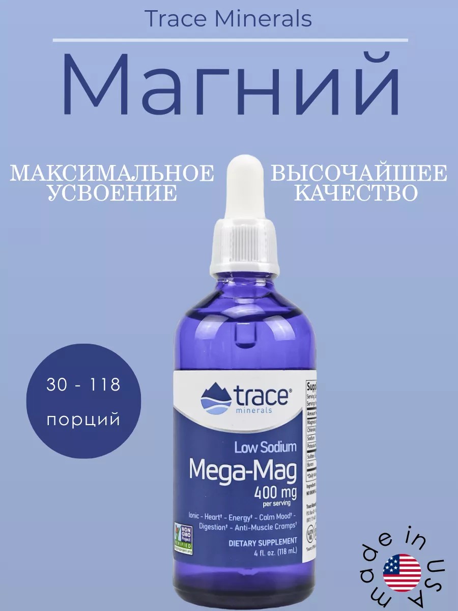 Liquid vitamin drops "Magnesium 400 mg" promote better heart function in the elderly, adult men and women over 50, adolescents, schoolchildren, children aged 1 year and older, and athletes. This high-quality soluble magnesium vitamin and mineral complex from a US manufacturer is absorbed much better than standard magnesium supplements in tablets, magnesium capsules, effervescent, or chewable forms. American-made magnesium vitamins are beneficial not only for the heart. They have been used for over 50 years in anti-stress therapy, help improve immunity, and, of course, in sports nutrition. Sports nutrition must include magnesium, as athletes typically put extreme strain on the heart. Therefore, magnesium supplements are essential. The magnesium mineral complex is also known for its properties in stimulating brain function to improve mental performance, supporting beauty and dental health, and as an antidepressant. Hair loss is a sign of a magnesium deficiency. Magnesium is often used to reduce stress during menopause and normalize sleep. This dietary supplement is highly soluble, so it can be easily added to food at the recommended dosage using a dropper. This property is especially useful for young mothers breastfeeding small children aged 1, 2, and 3 years. Magnesium works well in combination with zinc, fish oil, omega-3, multivitamins B, D, A, E, and Q, probiotics, and calcium. There are several types of organic and synthetic magnesium: citrate, chelate, glycinate, malate, taurate, sulfate, threonate, bisglycinate, orotate, and, of course, the well-known B6 (B6). Magnesium is also available in sea salt form. American multivitamins are considered the best, helping maintain strong Siberian health and vitality during cool autumns, cold winters, and rainy springs. For those with sleep problems, this vitamin acts as a hypnotic and sedative. A good, sound sleep is guaranteed. Magnesium supplements will help restore energy and provide additional protection from stress. You can also find vitamins such as calcium, zinc, D3, iodine, vitamin C, and magnesium B6 in our store. Pregnant women, diabetics, and nursing mothers after childbirth are advised to consult a doctor before use. Compare and discover how Trace Minerals Research has been providing superior absorption, value, bioavailability, and quality for over 35 years. Take high-quality complexes from Trace minerals—the recognized #1 mineral brand in America!