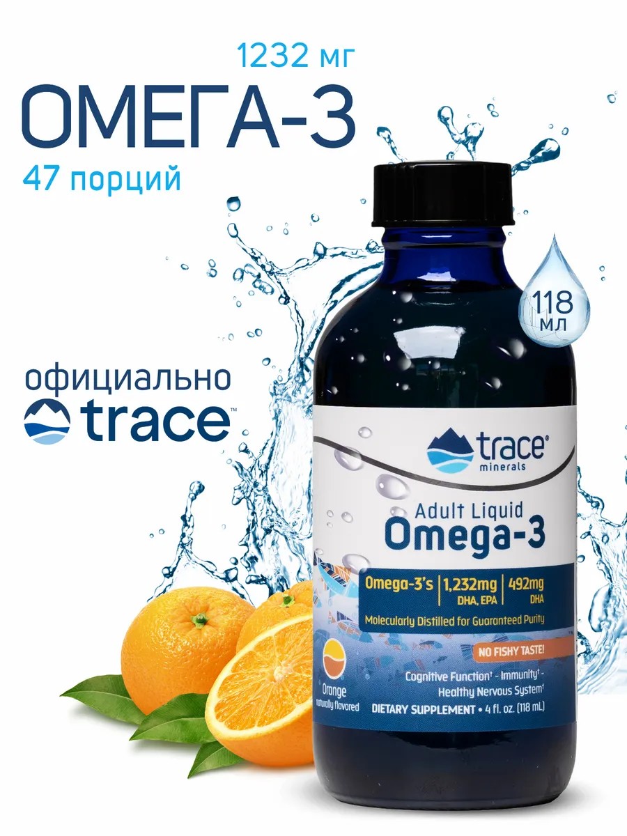 Liquid Omega-3 1232 mg highly concentrated Trace Minerals strengthens and supports the cardiovascular system, improves brain function, attention and memory, strengthens the immune system and supports the nervous system. Liquid fish oil trace normalizes blood pressure and cleanses blood vessels. The high concentration of DHA in neurons and the retina indicates that Omega 3 vitamins are vital for brain and eye function.