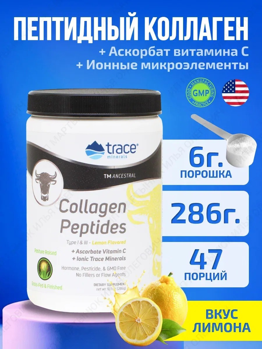 Trace Minerals Пептидный коллаген порошок + Витамин C 286 гр Лимон