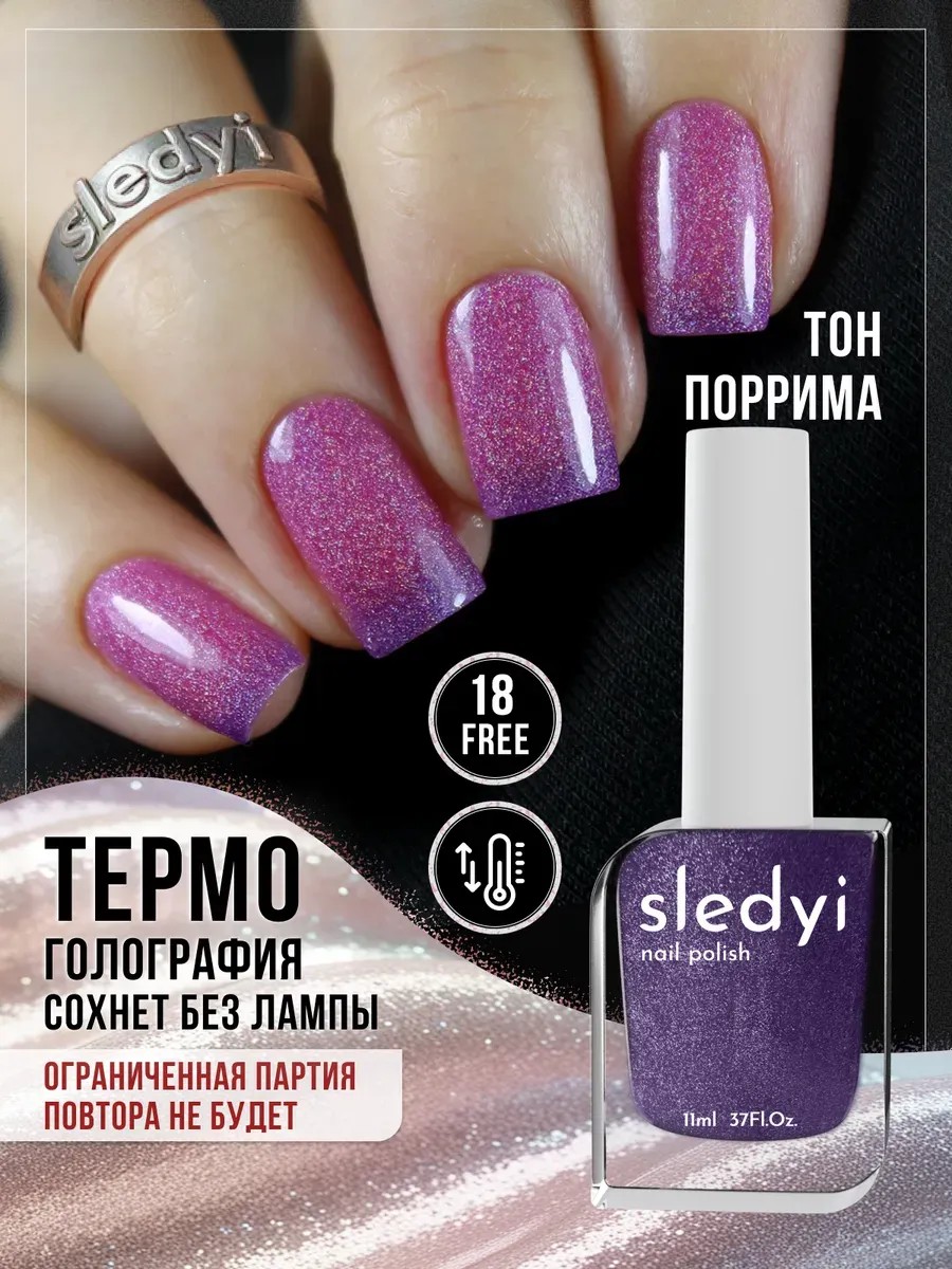Внимание! Представляем Вам лимитированную коллекцию голографических термо лаков от sledyi. Лак для ногтей "08Р Поррима" от sledyi – это идеальный выбор для тех, кто хочет добавить своему образу яркости и блеска. Он легко наносится и отлично смотрится на ноготках любой длины и формы. Лак с уникальным фиолетовым оттенком придаст вашим ногтям неповторимый сияющий эффект. Формула лака обогащена витамином Е, который укрепляет и восстанавливает ногтевую пластину, делая Ваши ногти не только красивыми, но и здоровыми. Продукт подходит для маникюра и для педикюра. Лак не требует сушки в лампе, что позволяет пользоваться им в домашних условиях. Он долго держится и легко снимается обычной жидкостью для снятия лака. Флакон имеет удобную кисть, что способствует комфортному нанесению продукта. Объем лака 11 мл - хватит на множество применений. Термолак – это отличный вариант для любого случая, будь то будний день или праздничное торжество. Выберите свой уникальный оттенок коллекции термолаков от sledyi!