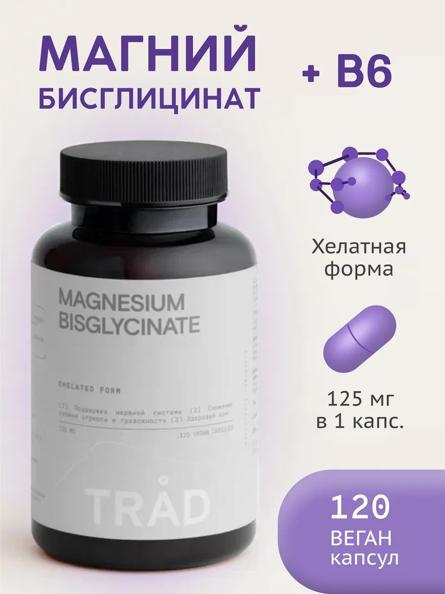 TRAD MAGNESIUM BISGLYCINATE - качественный источник магния в хелатной форме, усиленный витамином B6, для поддержки нервной системы, спокойного сна и защиты от стресса.
