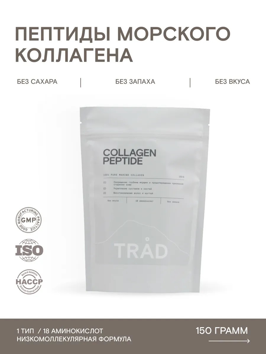 | Полное наименование товара | Морской коллаген порошок гидролизованный питьевой без добавок TRAD COLLAGEN PEPTIDE, витамины для кожи, волос ногтей, суставов, 150 г |