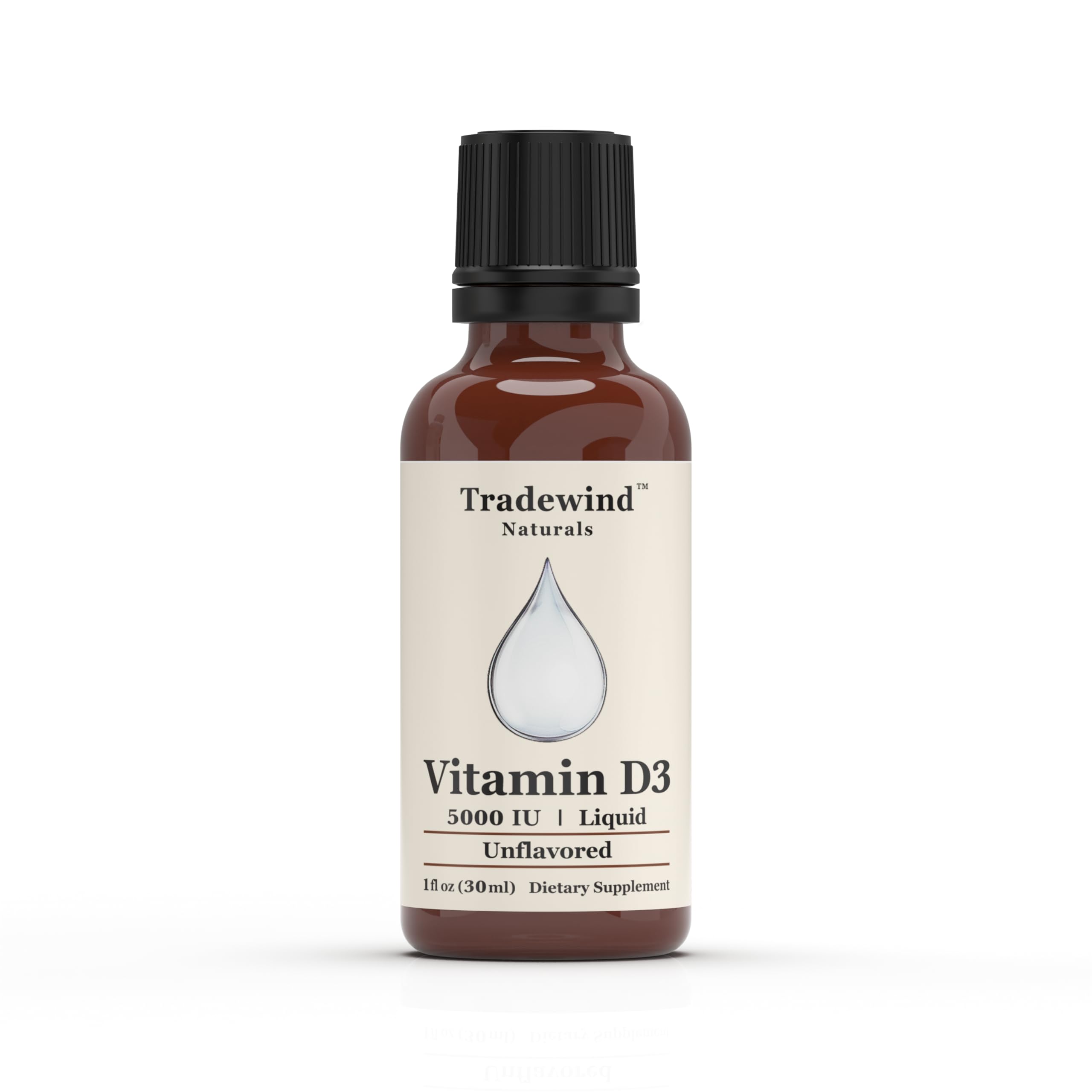 Shine From Within—Naturally Tradewind Naturals Vitamin D3 Drops deliver a clean, high-potency formula designed to support bone strength, immune health, and overall well-being—one drop at a time. Each serving provides 5000 IU of Vitamin D3 in a fast-absorbing liquid form, with adjustable dosing that puts you in control. Start with just one drop (1000 IU), or build up to a full five-drop serving (5000 IU), depending on your personal needs and the guidance of your healthcare provider. Unflavored and ultra-versatile, this formula mixes effortlessly into water, juice, smoothies, or any beverage of your choice—no taste, no hassle. With 177 servings per bottle at 5000 IU each, you get a long-lasting supply of this essential nutrient to help maintain natural energy, mood balance, and immune resilience throughout the year. Crafted without unnecessary fillers or additives, Tradewind Naturals Vitamin D3 Drops are non-GMO, vegetarian-friendly, and made in a GMP-certified, FDA-registered facility in the USA—for clean, trustworthy wellness from the inside out.TRUSTED QUALITY: Made in the USA in a GMP-certified, FDA-registered facility with strict quality controls to ensure purity, potency, and safety in every batch. . PURE, CLEAN, AND KOSHER-CERTIFIED: Crafted with a pure, clean formula. Kosher-certified (Kof-K) and free from common allergens and artificial additives. . LONG-LASTING SUPPLY — 177 SERVINGS: One bottle delivers up to 6 months of support for bone strength, immune health, and overall wellness. Non-GMO and vegetarian-friendly. . FAST-ABSORBING UNFLAVORED FORMULA: Our liquid drops absorb quickly and mix effortlessly into any drink — water, juice, or smoothies — with zero flavor. . HIGH-POTENCY, CUSTOMIZABLE DOSING: Get 5000 IU of Vitamin D3 per serving — with flexible dosing from 1 drop (1000 IU) to 5 drops (5000 IU). Easy to adjust based on your daily needs. .