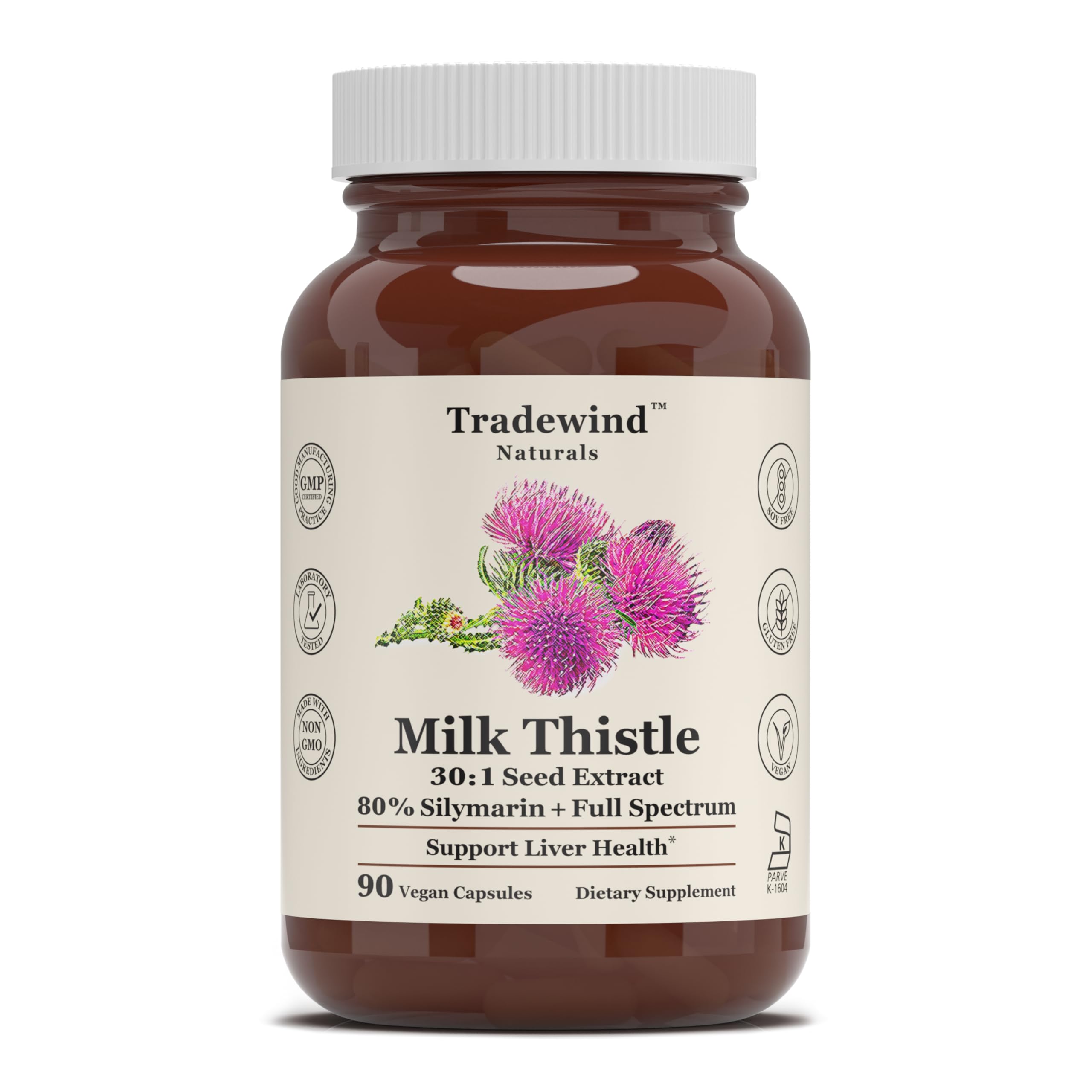 Give Your Liver the Support It Deserves Your liver works hard every day—filtering toxins, supporting digestion, and keeping your body balanced. Give it the natural support it needs with Tradewind Naturals Milk Thistle, a high-strength, full-spectrum formula designed to promote liver health, detoxification, and overall vitality. Each serving provides a 30:1 concentrated milk thistle seed extract, equivalent to 7,500 mg of raw seed, standardized to 80 silymarin—the active compound associated with supporting liver health. Whether you're recovering from occasional overindulgence or looking to maintain long-term liver wellness, this supplement offers natural, plant-based support. But we didn't stop there. Unlike basic extracts, our formula includes the full spectrum of milk thistle seed, retaining a wide range of naturally occurring compounds for more complete benefits—backed by science, trusted by many. Crafted for clean living, it's 100 vegan, non-GMO, Kosher-certified (Kof-K), and made with care in the USA in a GMP-certified and FDA-registered facility. No fillers. No compromises. Just effective, natural liver support in every capsule.TRUSTED QUALITY: Made in the USA in a GMP-certified, FDA-registered facility with strict quality controls to ensure purity, potency, and safety in every batch. PURE, CLEAN, AND KOSHER-CERTIFIED: Crafted with a pure, clean formula in 100 vegan, non-GMO vegetable capsules. Kosher-certified (Kof-K) and free from common allergens and artificial additives. Contains only potent milk thistle seed extract, organic milk thistle seed, and vegetable capsule—nothing else!. FULL SPECTRUM SUPPORT: Going Beyond Extracts for Well-Rounded Liver Support— What sets our formula apart? It combines 250 mg of a 30:1 concentrated milk thistle extract standardized to 80 silymarin with an added 200 mg of full-spectrum organic milk thistle seed—for a broader spectrum of plant-based support. Together, they deliver both the potency of the extract and the broad benefits of the whole seed—flavonoids, nutrients, and more—working in harmony to provide a balanced approach to overall liver wellness. STANDARDIZED 80 SILYMARIN: Silymarin flavonoids are the star compounds in milk thistle—often called its "hero ingredient." Our extract is standardized to 80 silymarin, delivering 200 mg per capsule. This high-strength formula provides one of the most potent levels of silymarin available for reliable, plant-powered support. HIGH POTENCY FORMULA: Formulated with a potent 30:1 Milk Thistle Seed Extract—250mg of milk thistle seed extract, equivalent to 7,500 mg of raw seed per serving—to naturally support liver health, aid in detoxification, and promote cleansing.
