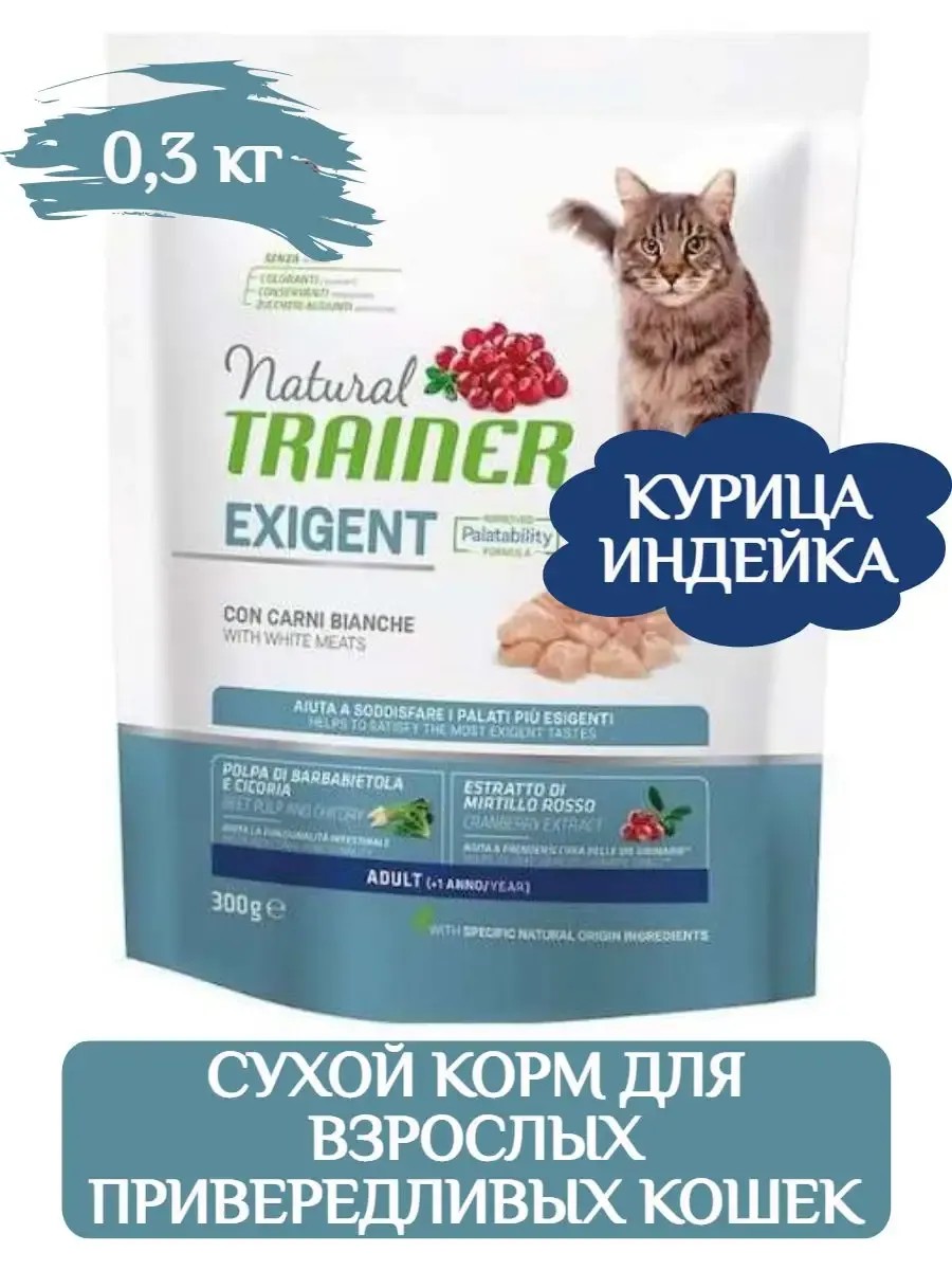 Trainer Natural Adult Exigent (Белое мясо) — это полноценный и сбалансированный корм для наиболее разборчивых в еде взрослых кошек в возрасте от 1 года. Преимущества: Помогает удовлетворить самые требовательные вкусы благодаря улучшенному рецепту кусочки получаются более вкусными, что делает корм более привлекательным для разборчивой в еде кошки. Улучшает работу кишечника - пребиотики натурального происхождения, содержащиеся в экстракте корня цикория и свекольном жоме, способствуют восстановлению микрофлоры кишечника и поддержанию ее правильного баланса. Здоровая кожа и блестящая шерсть - жирные кислоты омега-3 и омега-6, биотин и цинк обеспечивают хорошее состояние кожи и красивую шерсть. Способствует поддержанию здоровья мочевыводящих путей - экстракты клюквы и корня цикория натурального происхождения, а также контролируемое содержание минеральных веществ способствуют сохранению здоровья мочевыводящих путей. Уход за полостью рта - сухой экстракт яблока и особая форма витамина C помогают уменьшить образование зубного камня. Аналитический состав: Сырой белок 34%, сырые жиры 16%, сырая клетчатка 2,2%, сырая зола 6,7%, омега-3 0,8%, омега-6 3,5%. Питательные добавки: витамин А 27 500 ME, витамин D₃ 1600 МЕ, витамин E 510 мг, витамин C 100 мг, биотин 0,15 мг, таурин 2000 мг, пентагидрат сульфата меди (II) 19,65 мг (медь 5 мг), карбонат железа (II) 165,6 мг (железо 80 мг), йодат кальция безводный, гранулированный и покрытый оболочкой 0,62 мг (йод 0,4 мг), селенит натрия 0,22 мг (селен 0,1 мг), оксид цинка 93 мг (цинк 75 мг), оксид марганца (II) 9,68 мг (марганец 7,5 мг)., Зоотехнические добавки: хлорид аммония 4 г.