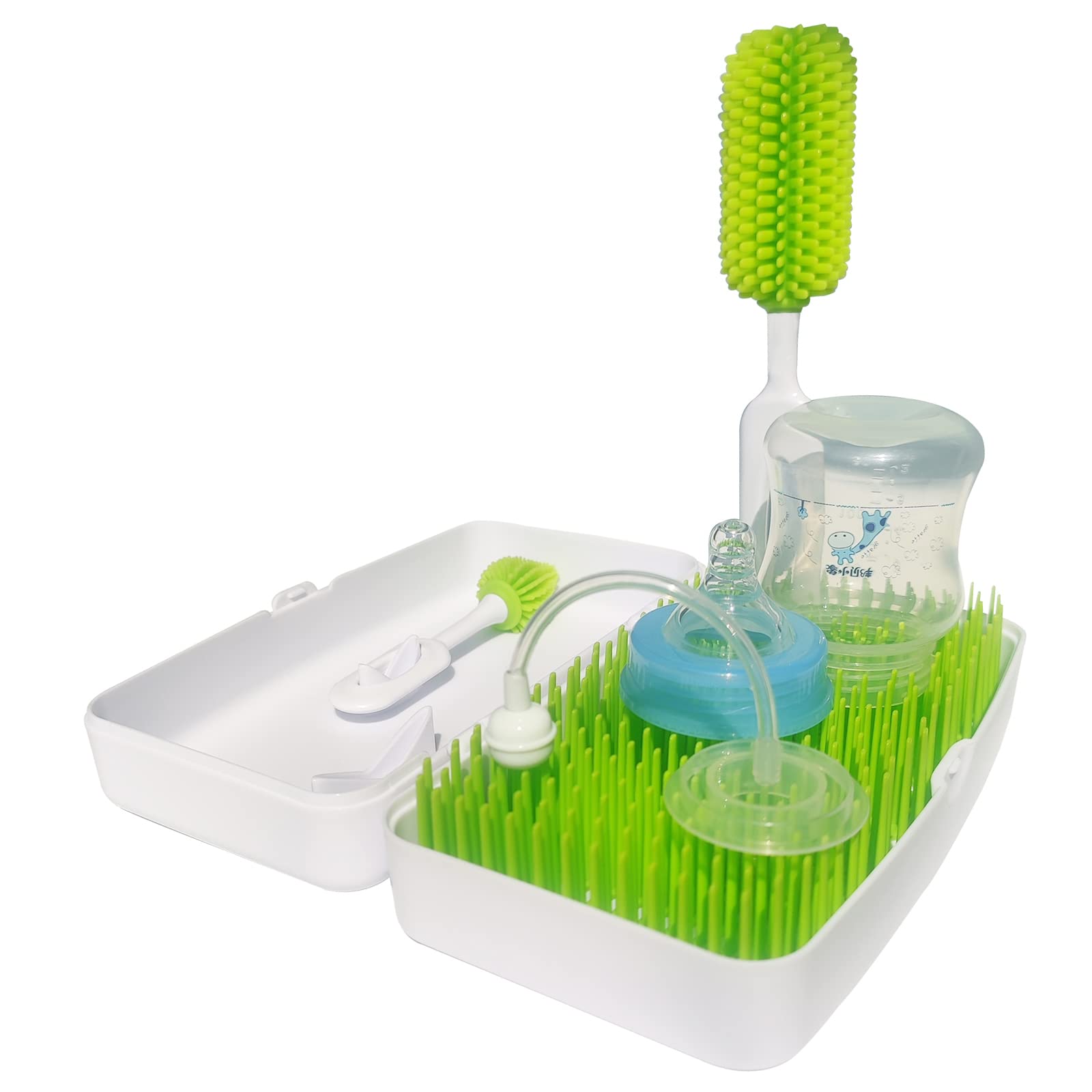 Grass hold items upright for drying while excess water collects in bottom tray. Bottle brush includes an integrated cleaner on handle. Compact size for travel. Easy Installation: Open the box, the bracket and brush will be displayed in the box. Assemble the teat brush and bottle brush together and place on the brush holder. Put the cleaned bottle and feeding accessories on the rack to dry.Convenient: Removable, reversible drip tray can be set to either catch water or drain into sink. Easy to Clean: Two-piece design is easy to pull rack out to clean it and dispose excess water and make it dry. Safe Material: The drying rack is made of PP material, nontoxic and BPA free.