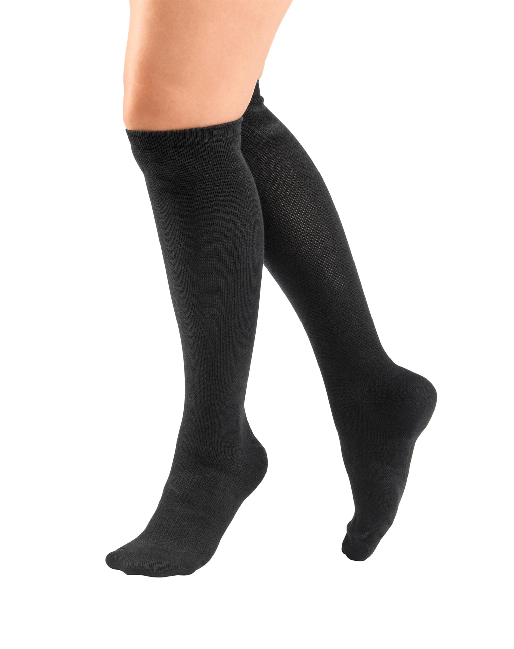 Wohltuende Entlastung Für Autofahrten, Zug- Flugreisen oder langes Laufen Beugt frühzeitiger Ermüdung der Beine vor Stufenloser Kompressionsverlauf: von starker Kompression im Knöchelbereich bis zur leichten Unterstützung unterhalb des Knies. Beugt Ermüdung der Beine vor und unterstützt den Blut-Rückfluss zum Herz. Handgekettelte Spitze ohne Naht. Für Damen Herren. Ökotex-Standard 100. 67 Baumwolle, 30 PA, 3 EL.