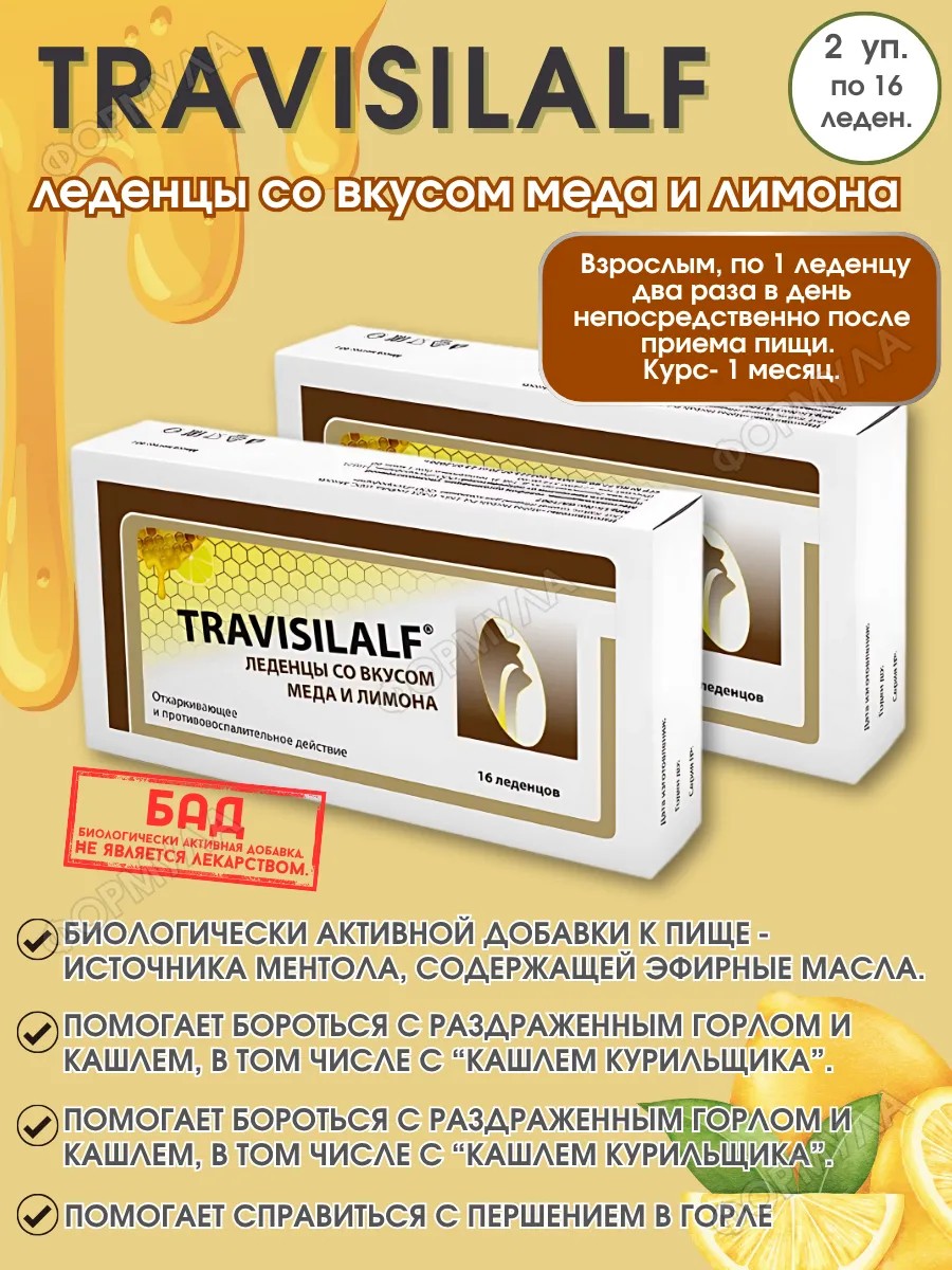 The dietary supplement "Lozenges with honey and lemon flavor" of the "TRAVISILALF" brand helps to cope with a sore throat, cough (including "smoker's cough").