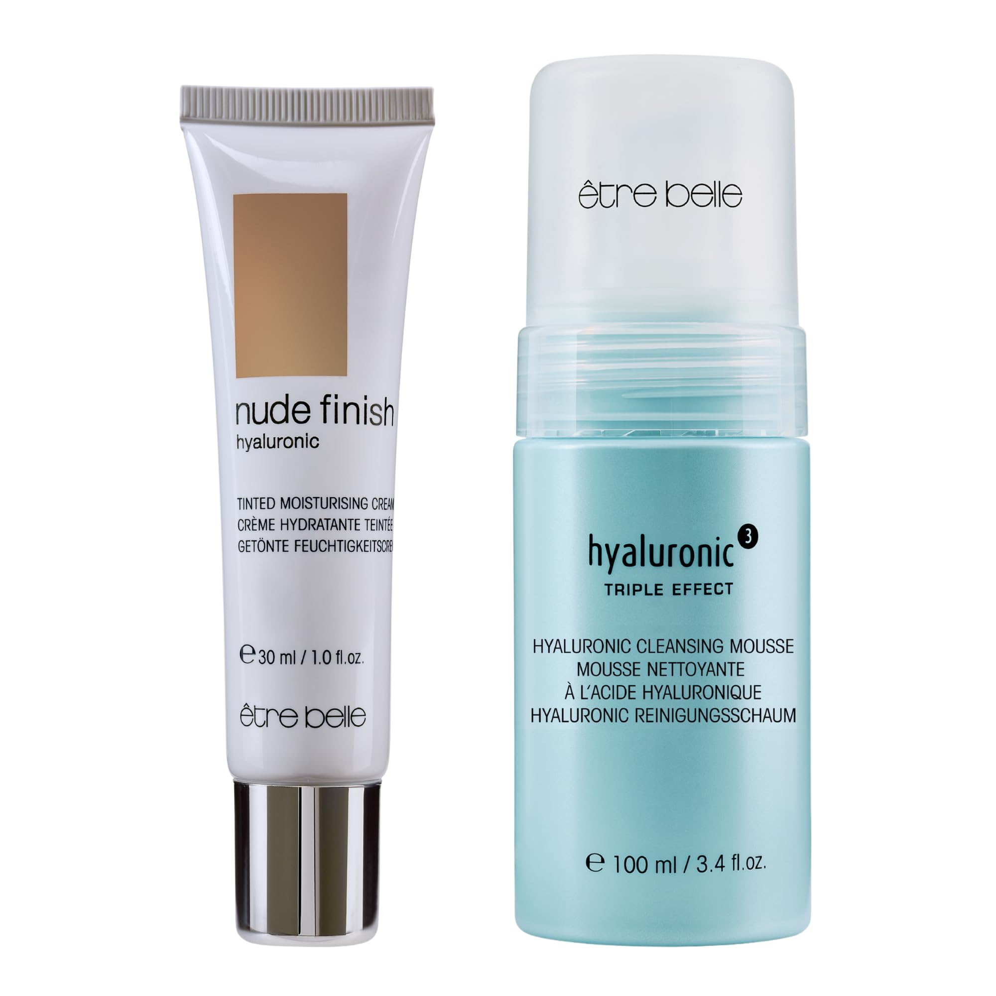 The être belle Hyaluronic Tinted Moisturizer and Cleansing Mousse Bundle brings together two essential steps for an easy and enjoyable daily skin care routine. Designed for all skin types, this duo delivers a gentle cleanse followed by lightweight hydration and sheer natural coverage, making it ideal for anyone seeking a simple approach to everyday care. Whether used for busy mornings or relaxed evening rituals, the combination of soft foam cleansing and breathable moisture creates a refreshed and comfortable finish that suits a wide range of lifestyle needs. The Hyaluronic Cleansing Mousse features a cloud soft texture that lifts away daily impurities while maintaining the skin's natural comfort. Hyaluronic acid supports surface hydration, betaine helps balance the complexion, and lactic acid provides gentle exfoliation that leaves the skin smooth and fresh after cleansing. The mousse is easy to use in both morning and night routines and rinses cleanly without residue. Following this, the Hyaluronic Tinted Moisturizer adds a touch of sheer natural coverage along with lightweight moisture. Its silky formula blends hyaluronic acid with grape seed oil, olive oil, wheat protein, vitamin E, and squalane to help the skin feel soft and hydrated. The finish is breathable, even looking, and adaptable for minimal makeup days or more polished looks. It smooths quickly over the skin, making it a practical option for daily use, travel, or any routine that calls for fast and comfortable application. Together, these two products form a simple yet effective routine that supports hydration and a naturally refined appearance. Made in Germany, both formulas highlight être belle's commitment to carefully selected ingredients and sensorial textures that fit seamlessly into everyday life. This bundle offers a balanced approach to cleansing and moisture, creating a routine that feels easy, gentle, and refreshingly straightforward.CRAFTED IN GERMANY WITH CAREFULLY SELECTED INGREDIENTS: Each formula reflects être belle's focus on comfort driven textures and thoughtful ingredient combinations. Pair this bundle with other être belle favorites such as the Hyaluronic3 Day and Night Cream or Eye Cream to build a personalized hydration routine. EASY TO USE AND TRAVEL FRIENDLY: Cleanse with the mousse to refresh the skin, then follow with the tinted moisturizer for a smooth hydrated finish. Both products are designed for simple daily use at home, in the shower, or on the go. They absorb easily and layer well with other skin care or makeup items. LIGHTWEIGHT CREAM WITH SHEER NATURAL COVERAGE: The Nude Finish Tinted Moisturizer blends hyaluronic acid with grape seed oil, olive oil, vitamin E, wheat protein, and squalane. It helps even the appearance of tone and provides a breathable, silky feel that works well for busy mornings, minimal makeup days, or a soft polished look. HYDRATING FOAM CLEANSER FOR MORNING AND NIGHT: The Cleansing Mousse removes daily buildup with a soft lather that leaves the skin feeling refreshed and comfortable. Formulated with hyaluronic acid, betaine, and lactic acid, it supports smoother and more supple looking skin as the first step of your daily regimen. DAILY SKIN CARE MADE SIMPLE: This two piece set combines the Hyaluronic Tinted Moisturizer with the Hyaluronic Cleansing Mousse to create an easy everyday routine. The mousse refreshes the skin with soft, cloud like foam, while the tinted moisturizer adds lightweight hydration and a natural looking finish suitable for all skin types.