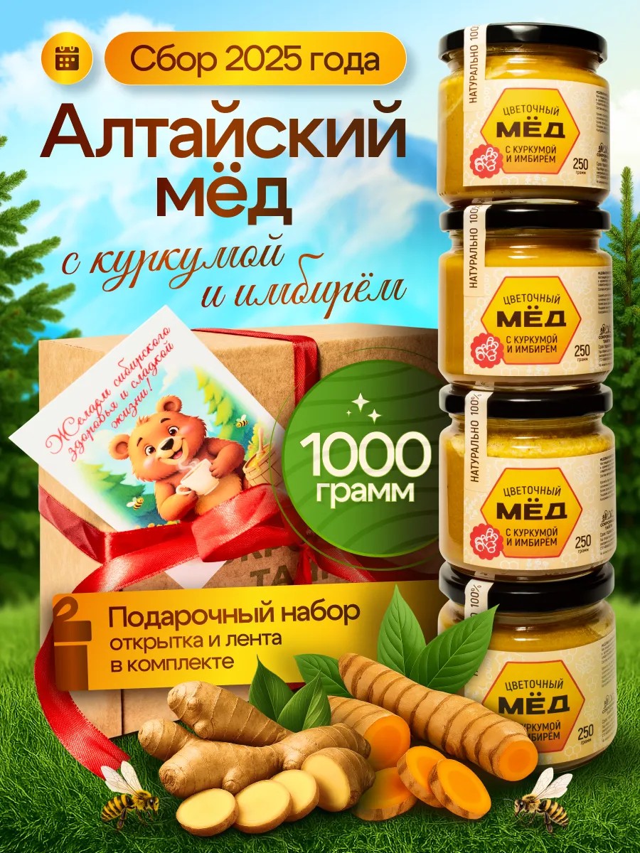 Подарочный набор меда с куркумой и имбирем (4 баночки по 250 г) - это 100% натуральный продукт, собранный в экологически чистых районах Алтайского края и Республики Алтай. Наша собственная пасека гарантирует высокое качество и чистоту каждого продукта.