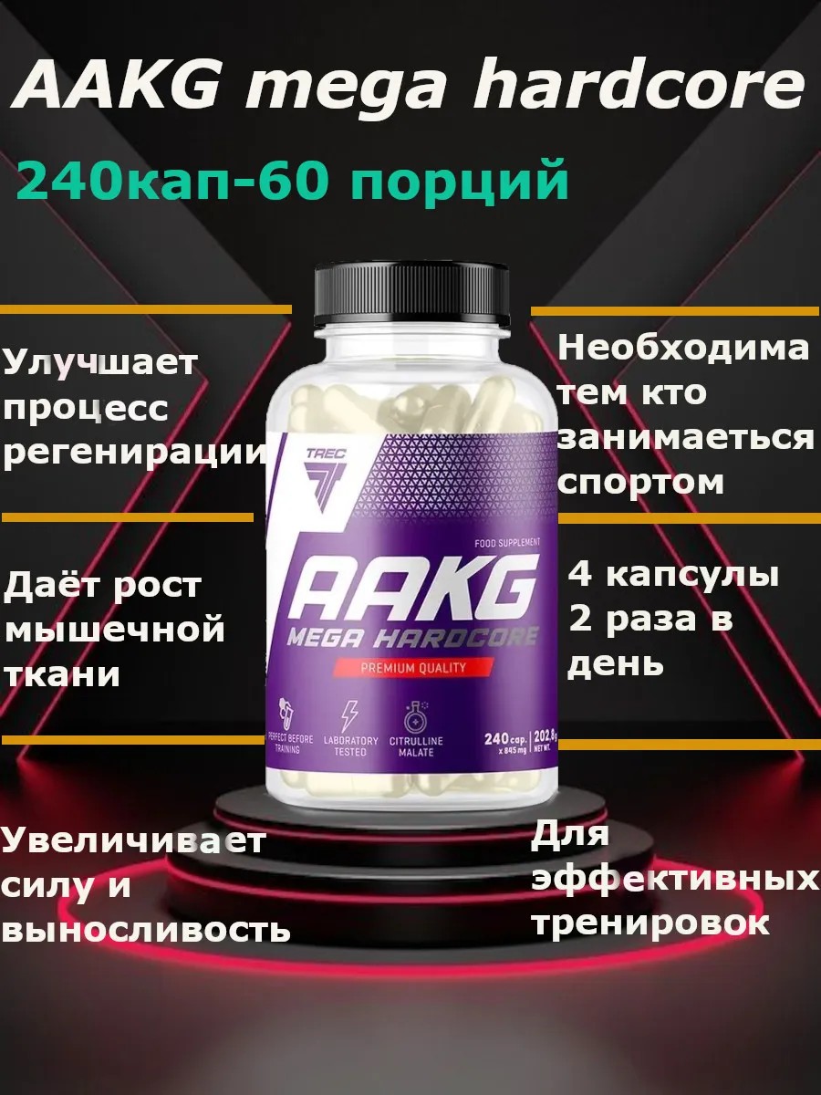 ААКГ Мега Хардкор AAKG Mega Hardcore — исключительная композиция наиболее биоактивной формы Л - аргинина (l-arginine) — альфа - кетоглютарата и Л - цитруллина малата. Ингредиенты аргинина усиливают выделение окиси азота (NO) в организме, что стимулирует кровоснабжение мышц, повышает обеспечение их основными энергетическими строительными компонентами. Л-Аргинин - условно незаменимая аминокислота, приводит к значительному повышению силы, выносливости организма во время интенсивных тренировочных процессов, улучшает процесс регенерации набора мышечной массы. Дополнительным преимуществом спортпит является улучшение потенции. Оксид азота регулирует тонус сосудов, влияет на артериальное давление, кровоснабжение тканей, органов, включая мышцы. Одноразовую дозу препарата (AAKG + l аргинин(arginine) – 4 капсулы употреблять 2 раза/день, запить 300 мл воды. В дни спорт тренировок: I порция – за 30 мин. до начала занятий, II порция – сразу после занятий. В дни, свободные от тренировок: I часть – за 30 мин. до первого приема пищи, II часть – перед сном. Не нужно превышать рекомендованную дневную дозу. Препарат не считается заменителем полноценного питания.
