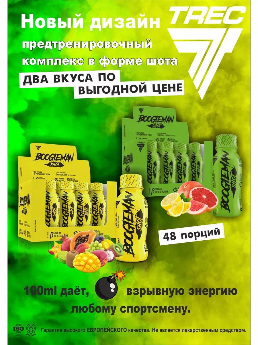 Акция!!! Два взрывных вкуса ( 12шт грейпфрут-лимон + 12шт тропик) по выгодной цене!!! Предтренировочный комплекс Boogieman от Польской компании Trec Nutrition поможет справиться с усталостью, вялостью и недостатком силовых показателей (выносливости) моментально. Boogieman от Trec Nutrition - это один из самых продуктивных предтренировочных комплексов для выносливости. В составе комплекса присутствует цитруллин малат, который повышает работоспособность организма, способствует нормализации обмена веществ, помогает в период выздоровления после перенесенных заболеваний, также способствует детоксикации печени. Предтрен действует лучше, чем любой энергетик и подходит как профессиональным спортсменам так и спортсменам любителям. Действует он очень мягко, но при этом эффективно , не вызывая головных болей и трясущихся рук. Предтреник содержит в 1 порции : Бета-аланин, таурин, L-аргинин, AAKG, цитруллин малат , безводный кофеин. Предтренировочный комплекс для мужчин и женщин- это огромная концентрация на долгое время и мощная сила при тяжелой работе ! Спортивное питание энергетик БАД без сахара и лактозы.