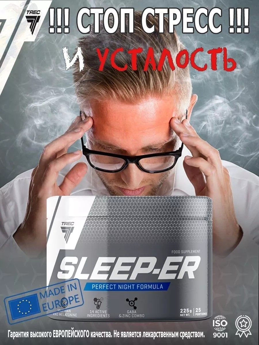 Sleep-er от Польской компании Trec Nutrition - комплексная пищевая добавка для снятия сильной усталости, против стресса и нормализации сна. Это мощное средство для релаксации и стрессоустойчивости активных спортсменов, людей подверженных сильной физической или умственной усталости с недостатком сна для восстановления. С добавкой слипер для сна вы забудете об усталости и плохом настроении. ЦЕНА = КАЧЕСТВО Ваш выбор очевиден SLEEP-ER от Польской компании Trec Nutrition! Способ употребления: одноразовую порцию продукта - 9 г.(1,5 мерки) растворить в 150-200 мл. воды. Следует употреблять 1 порцию ежедневно, желательно за 30 мин. до сна. Продолжительность приема - 3 месяца. Источник аминокислот и растительных экстрактов. Перед применением рекомендуется проконсультироваться с врачом.