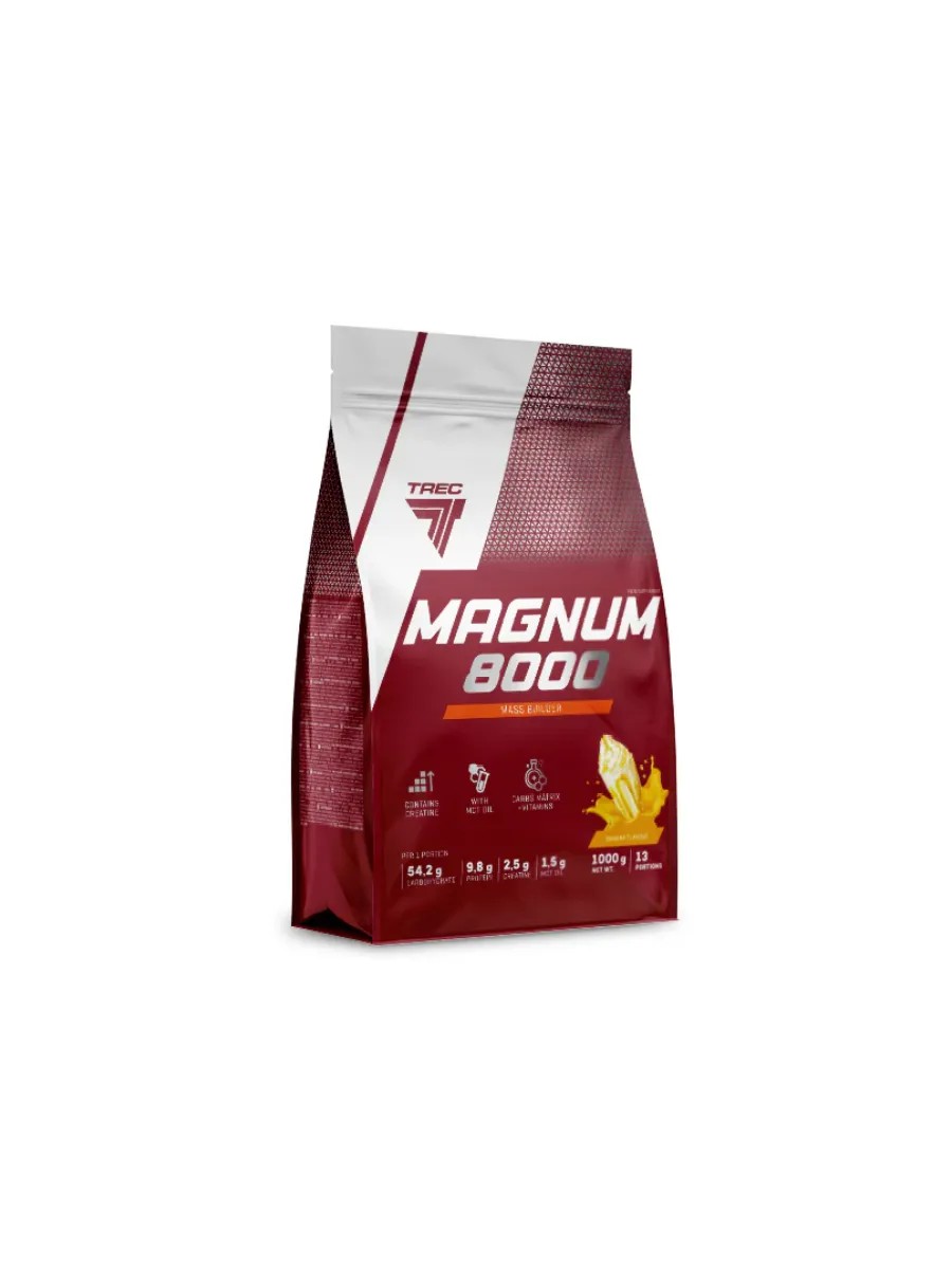 Trec Nutrition MAGNUM 8000, 1000 г — Высококалорийный гейнер для быстрого набора массы : Trec Nutrition MAGNUM 8000 — это мощный гейнер из Польши, созданный специально для тех, кто стремится набрать мышечную массу и восстановить силы после интенсивных тренировок. Продукт содержит сбалансированную комбинацию высококачественного белка, углеводов и креатина, что делает его отличным выбором для спортсменов и тех, кто активно работает над улучшением физической формы. Преимущества состава: Высокое содержание калорий: Каждая порция обеспечивает организму необходимое количество энергии для поддержания роста мышц и восстановления после интенсивных нагрузок. Креатин: Поддерживает увеличение силы и выносливости, помогая быстрее достигать результатов на тренировках. Белки и углеводы: Сочетание быстроусвояемых углеводов и белков способствует восстановлению гликогена и обеспечивает длительное питание мышц. Аминокислоты и витамины: В составе присутствуют незаменимые аминокислоты (BCAA) для предотвращения мышечного катаболизма, а также витамины группы B для повышения уровня энергии и поддержки обменных процессов. Разнообразие вкусов: Trec Nutrition MAGNUM 8000 представлен в нескольких вкусах, которые сделают его прием еще приятнее: Банан — сладкий и освежающий вкус для любителей тропических ароматов. Карамель-Ваниль — нежное сочетание ванильной сладости с нотками карамели. Шоколад — насыщенный и богатый шоколадный вкус для тех, кто ценит классику. Клубника — легкий и фруктовый вкус для настоящих гурманов. Этот гейнер не только эффективно помогает набрать массу, но и превращает каждую порцию в удовольствие благодаря разнообразию вкусов.