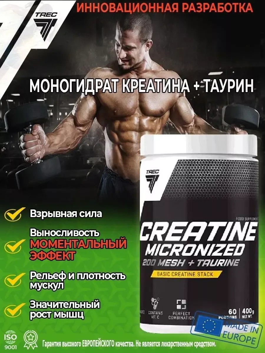 Микронизированный Моногидрат Креатина с Таурином это эффективная инновационная разработка Польской компании Trec Nutrition. Такая форма креатина легко усваивается организмом и быстро синтезирует энергию, необходимую для проведения максимально продуктивной тренировки. Препарат способствует повышению концентрации креатина в мышцах, увеличению работоспособности организма, усилению процессов синтеза белка и гипертрофии мышечной ткани. Дополнен витамином С и таурином, которые усиливают действие креатина. Рекомендуется в качестве универсального средства, позволяющего поддерживать спортивную форму на высоком уровне в силовых и скоростно-силовых видах спорта. Предназначен для увеличения максимальной и взрывной мышечной силы, силовой и скоростной выносливости, приобретения рельефности и плотности мускулатуры, наращивания сухой массы мышц, укрепления сердечно-сосудистой и нервной систем. Снижает боли в мышцах после физических упражнений, способствует похудению и ускоренному восстановлению.