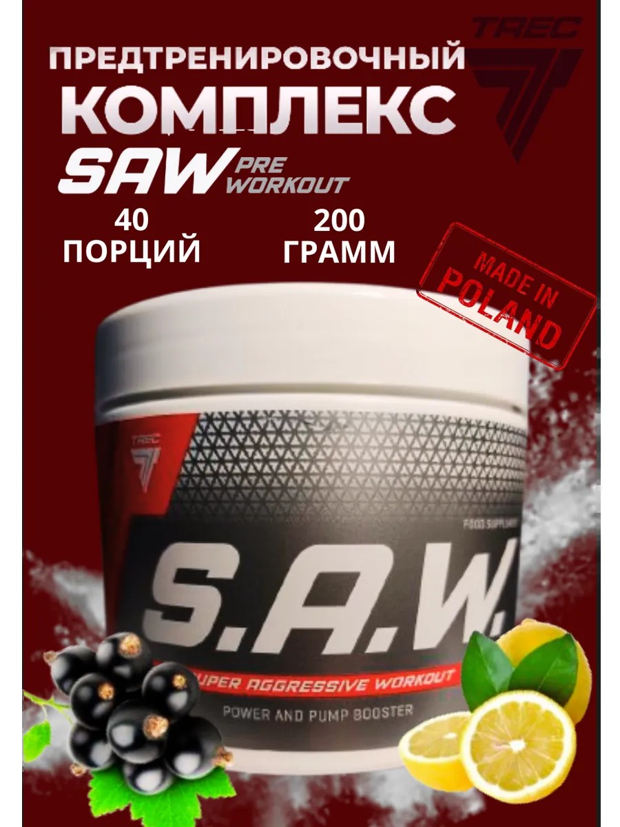 Предтрен в порошке - предтренировочный комплекс (S.A.W. от Trec Nutrition) — концентрированная формула для повышения силы, выносливости и энергии перед тренировкой. Содержит аминокислоты, креатин, кофеин и растительные экстракты для улучшения кровообращения, фокуса и мышечного пампа (памп спорт пит, pump). Предтреник подходит для интенсивных и силовых тренировок. Не содержит сахара и консервантов. Обеспечивает 40 порций в упаковке.