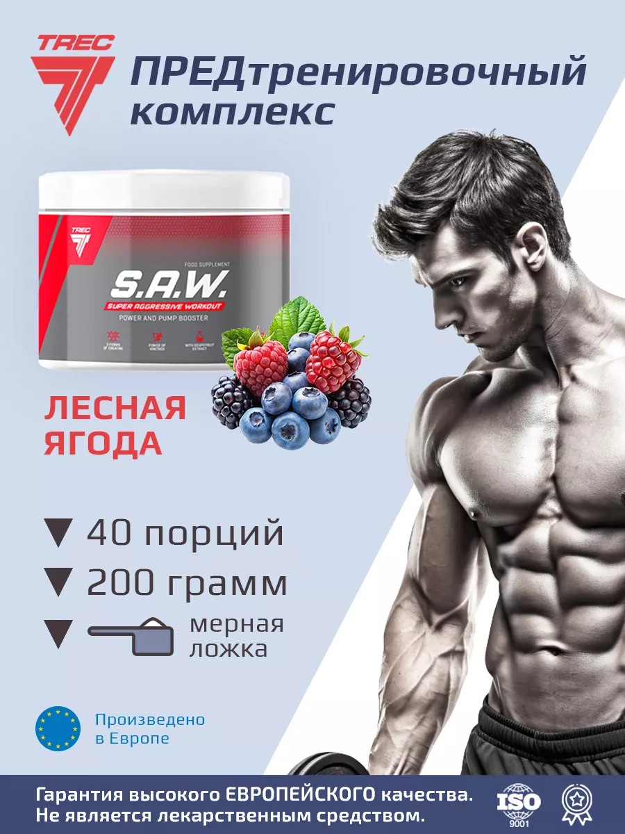 S.A.W. от Польской компании Trec Nutrition 200g - это супер концентрированная предтренировочная формула, предназначенная для профессиональных спортсменов и любителей. Предтренировочный комплекс имеет приятный вкус, который придает ему освежающий и фруктовый аромат. Предтрен обладает сильным анаболическим действием и стимулирует ускоренный рост работающих мышц. S.A.W. обеспечивает дополнительное снабжение мышц кислородом и питанием. Уникальный комплекс бета-аланина и активных нейростимуляторов повышает выносливость и концентрацию, увеличивает энергетические ресурсы организма, а также улучшает работоспособность организма во время тяжелых физических нагрузок. Этот энергетический бустер S.A.W, противодействует преждевременной усталости и чрезмерному закисанию тканей. Предтренировочный комплекс S.A.W. — это формула, сочетающая исключительно проверенные, безопасные и эффективные активные вещества, которые помогут вам преодолеть тренировочный застой уже после первого приема. Этот продукт без лишних добавок, наполнителей и сахара. Благодаря необыкновенно высокому уровню концентрации (почти 96% рецептуры препарата составляют активные вещества) и самому качественному сырью, каждая доза препарата скрывает в себе огромный анаболический и энергетический потенциал. Компоненты продукта, обладающие синергетическим действием, резко увеличивают возможности организма для работы с большими нагрузками. Внимание!!! Продукт имеет сильное возбуждающее действие, не употреблять перед сном!
