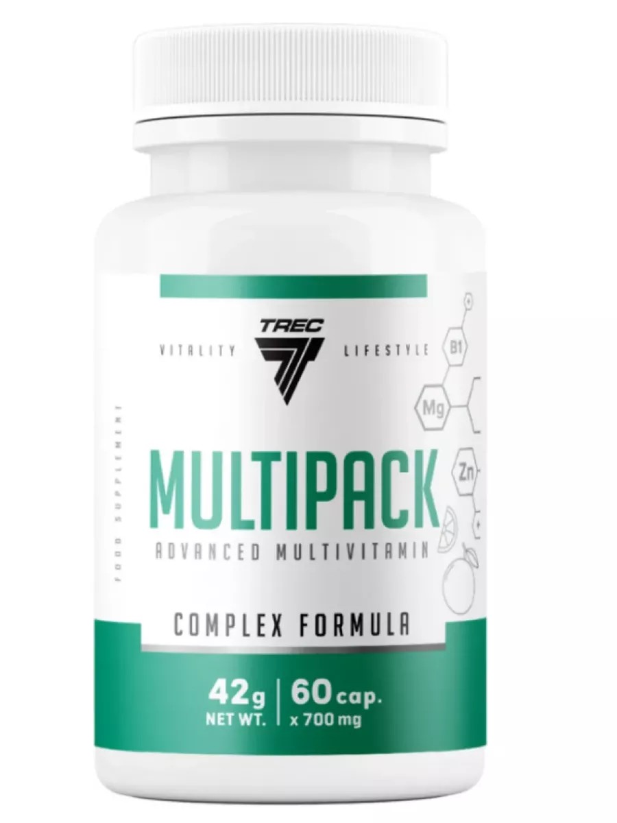MULTI PACK - это органический тонизирующий мультивитаминный препарат, состоящий из 12 витаминов и 9 минералов. В его составе также входят запатентованные смеси трав, травяные энзимы, биофлавоноиды, нуклеиновые кислоты РНК и ДНК. Данный витаминный комплекс предотвратит вас от нежелательных травм,болезней,вирусов, укрепит ваши волосы,ногти,суставы,связки,кости. Таблетки-капсулы наполненные витаминами,лучший товар для здоровья и его поддержания в любое время года! MULTI PACK от Trec Nutrition создан для тех, кто ведет активный образ жизни, и помогает справиться с усталостью, чтобы не пропускать ни одной тренировки. При рабочих дозировках для занятий спортом витаминный противовирусный комплекс также подходит для людей, просто следящих за своим здоровьем и желающих поддержать его в периоды холодов и простуд. Рекомендуемая дневная порция - 2 раза в день по 1 таблетке непосредственно после еды.