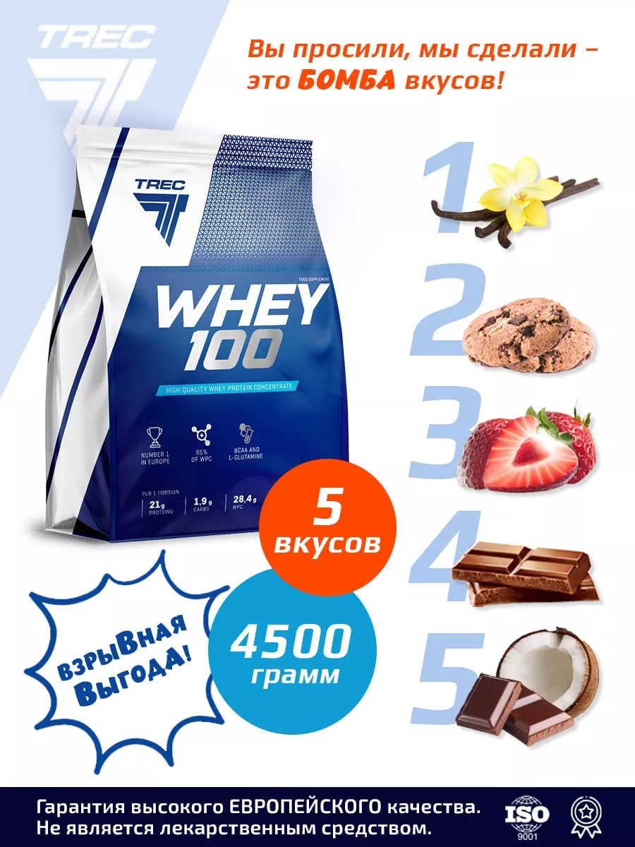 Протеин WHEY100% (5 ВКУСОВ (Шоколад, Клубника, Печенье, Шоколад-Кокос- не приторный) - полностью состоит из чистого высококачественного концентрата белка сыворотки (концентрация чистого белка-более 80%, который является превосходным источником полноценных животных протеинов. В состав входит исключительно сывороточный белок, без примесей, снижающих содержание протеина в продукте. Концентрат сывороточного белка - это один из наиболее популярных и эффективных протеинов природного происхождения. Продукт идеально компенсирует недостаток белка, при повышенной потребности организма у людей, занимающихся профессиональным спортом, культуризмом, ведущих активный образ жизни, а также у людей, находящихся на диете для похудения. Сывороточный белок легко усваивается организмом. Так как этот белок переваривается и усваивается крайне быстро, то наиболее важные анаболические аминокислоты мгновенно поступают в мышцы. Исключительно очень высокое содержание быстроусвояемого Л-лейцина инициирует анаболические процессы. WHEY100% правильный выбор!