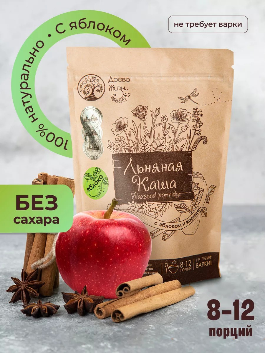 Натуральная льняная каша-уникально сочетает в себе вкус яблока и аромат пряной корицы. Диетический продукт правильного питания, который позаботиться о вашем здоровье. В нашем составе перемолотые цельные семена белого масличного льна с добавлением яблока и корицы. Насыщена большим количеством витаминов, омега 3 и омега 6 - прекрасно подойдет взрослым и детям с 3 лет. Легкое и быстрое приготовление делает её превосходным завтраком в любой день, просто добавьте немного теплой воды, молока или кефира - всё ваш завтрак готов. Наша каша - это настоящий диетический продукт, который поможет вам контролировать свой вес и подарит ощущение сытости на долгие часы. Благодаря отсутствию сахара и молочных добавок, она идеально подойдет для людей с диабетом, вегетарианцам. Многоразовая застежка обеспечит удобное и долговечное хранение, сохраняет свежесть и вкус продукта. После вскрытия рекомендуем хранить в холодильнике. Сделайте своё утро добрым, а день полным энергии. Приятного аппетита! С любовью бренд Древо Жизни Сладень.
