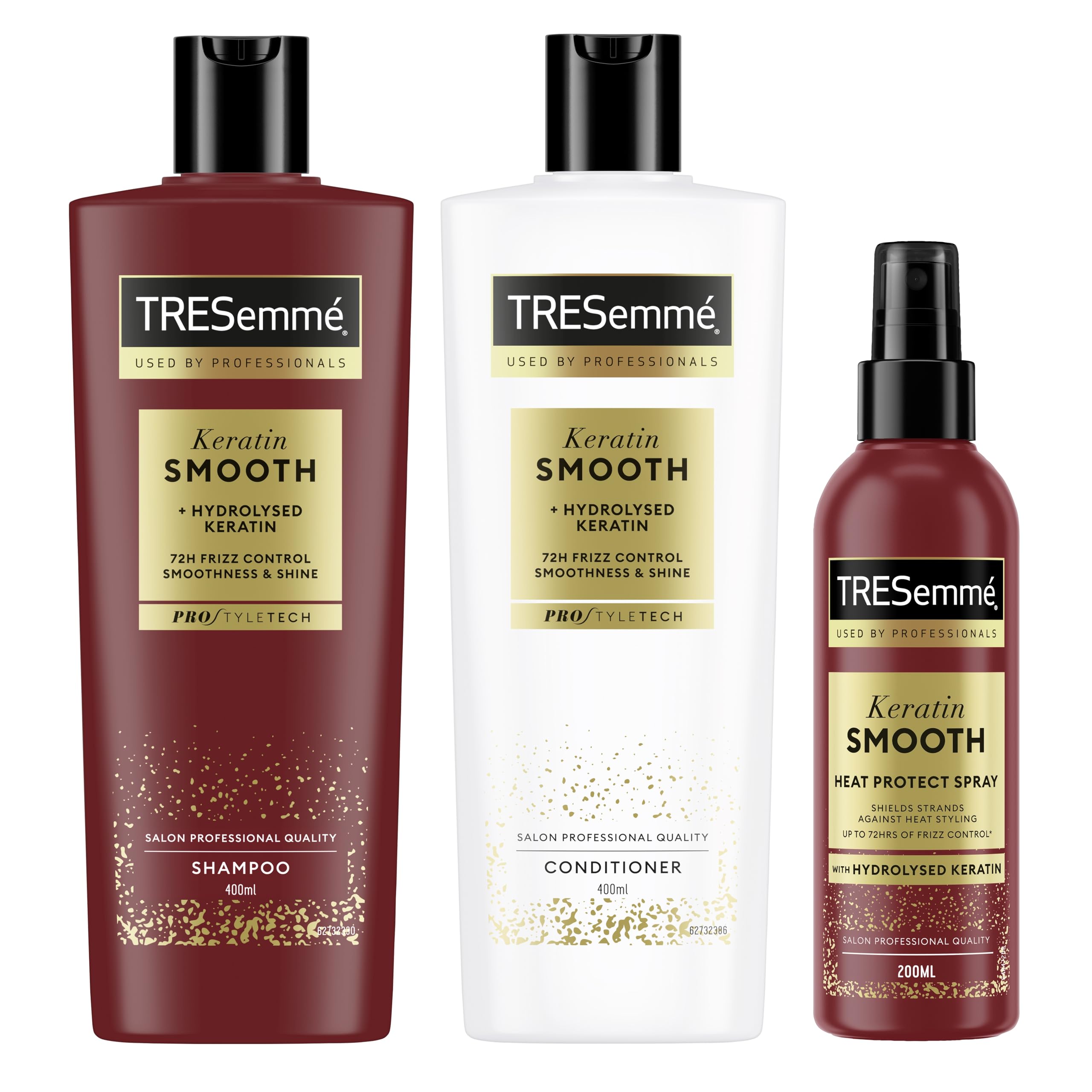 Heat protection up to 230 C : TRESemmé Keratin Smooth Heat Protectant Spray protects your hair from damage caused by hot styling tools. Conditioner with PRO Style Technology: TRESemmé Keratin Smooth Conditioner works from within, strengthening your hair and making it more manageable with every use. Shampoo for frizz-prone hair: TRESemmé Keratin Smooth Shampoo removes buildup to create the perfect base for professional-quality styling. Complete regimen for maximum impact: Use these TRESemmé hair care products together to maximize results. Hair care routine with hydrolyzed keratin: Our Keratin Smooth range provides long-lasting smoothness, shine, and up to 72 hours of frizz control . Transform your curly hair into a sumptuously smooth look with the TRESemmé Keratin Smooth anti-humidity hair care routine: shampoo, conditioner and heat protectant spray.