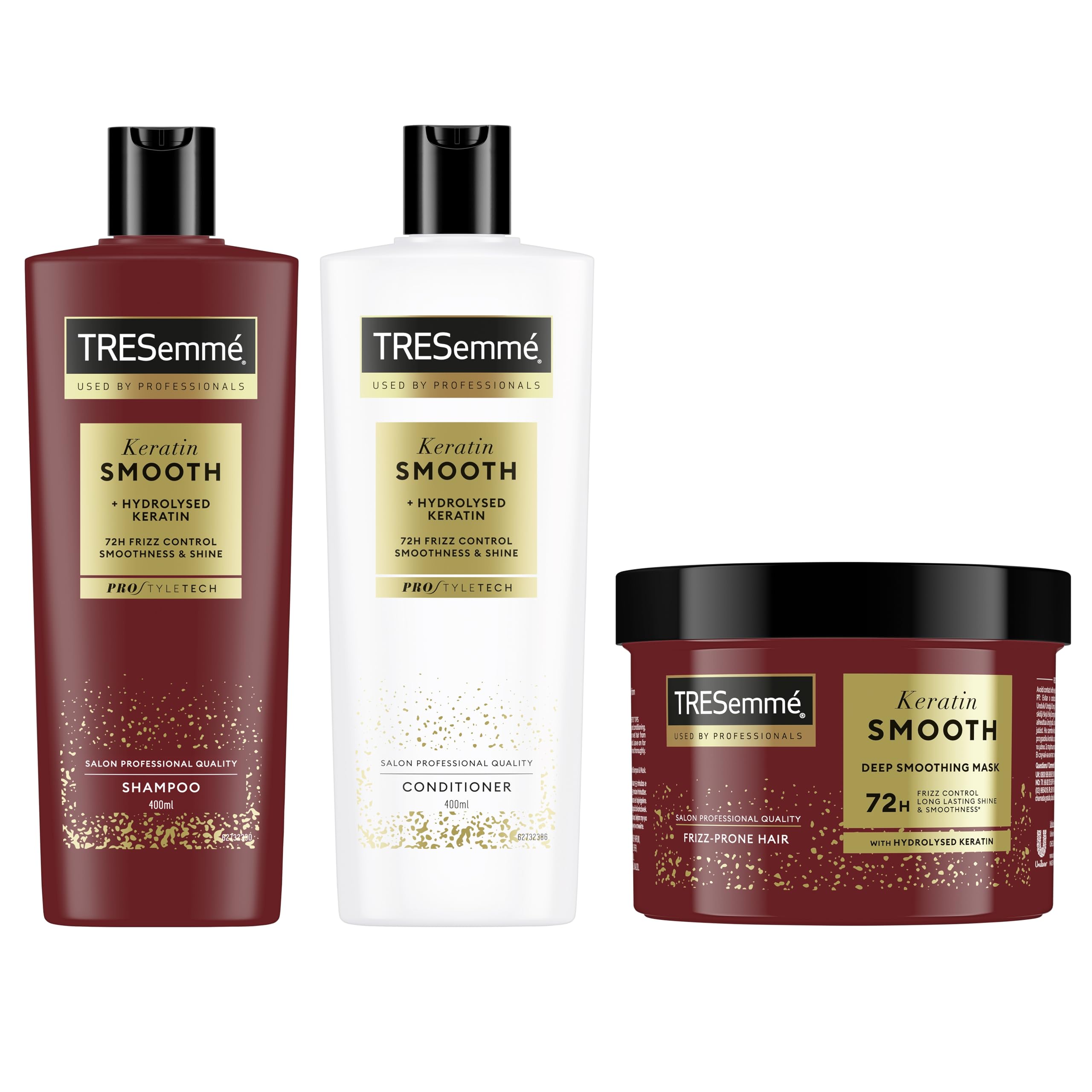 : Achieve strong, manageable, and shiny hair with professional results without a trip to the salon thanks to the TRESemmé Keratin Smooth Shampoo, Conditioner, and Mask Set. Enriched with hydrolyzed keratin, marula oil, and our PRO Style Technology, the moisturizing formula in this set fights frizz for up to 72 hours , restoring softness and shine without weighing hair down. Your hair will be detangled and easy to style. Apply a generous amount of shampoo to wet hair, massage into a lather, and rinse. Next, apply the conditioner, leave on for 2-3 minutes, and rinse thoroughly. As a final step, apply the mask, leave on for 2-3 minutes, and rinse thoroughly. For best results, we recommend using the entire Keratin Smooth routine, which also includes the heat protectant spray and nourishing oil. With TRESemmé, your style lives up to your ambitions. When used in combination with TRESemmé Keratin Smooth Conditioner. Directions: Wet hair. Apply TRESemmé Keratin Shampoo and massage into the scalp. Leave on for 3 to 5 minutes and rinse thoroughly. Apply TRESemmé Keratin Smooth Mask through wet hair, focusing on the ends and working up to the mid-lengths, avoiding the roots. Leave on for 3 to 5 minutes and rinse thoroughly. Apply TRESemmé Keratin Smooth Shampoo to wet hair, massage, and rinse thoroughly. Safety Warning: For external use only. Avoid contact with eyes. See more