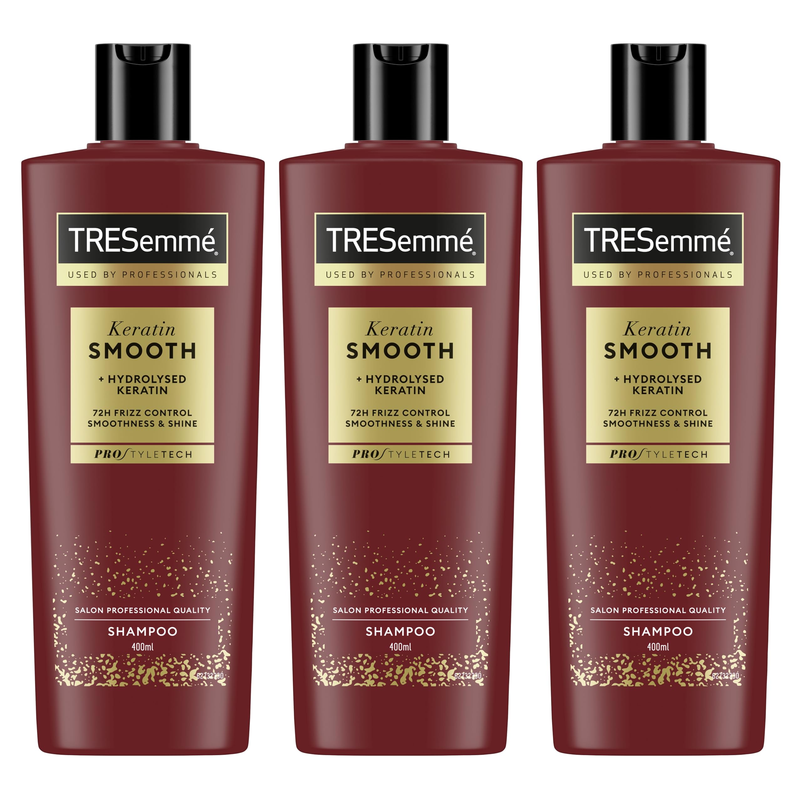 PACKAGE CONTENTS: 3x TRESemmé Keratin Smooth Anti-Frizz Shampoo, For Straight Hair, Smooth and Shiny Hair, Up to 72 Hour Anti-Frizz Action, With Hydrolyzed Keratin, 400ml. ENRICHED WITH KERATIN: The formula with hydrolyzed keratin deeply nourishes and hydrates each strand, restoring the hair's natural softness and shine. PRO Style Technology works from within to strengthen hair fibers. PROFESSIONAL AT-HOME ROUTINE: Apply the shampoo to wet hair, massage into a lather, and rinse. For best results, complete the TRESemmé Keratin Smooth routine with the conditioner, mask, heat protectant spray, and nourishing oil. DESIGNED FOR STRAIGHT HAIR: This TRESemmé shampoo was created for straight hair. Its anti-frizz action makes it an ally against unruly hair, for hydrated and manageable locks. SHINY, FRIZZ-FREE HAIR FOR 72 HOURS: Enjoy smooth, soft, and luminous hair as if you just stepped out of the salon. TRESemmé Keratin Smooth Shampoo fights frizz for up to 72 hours , for extraordinarily silky hair.