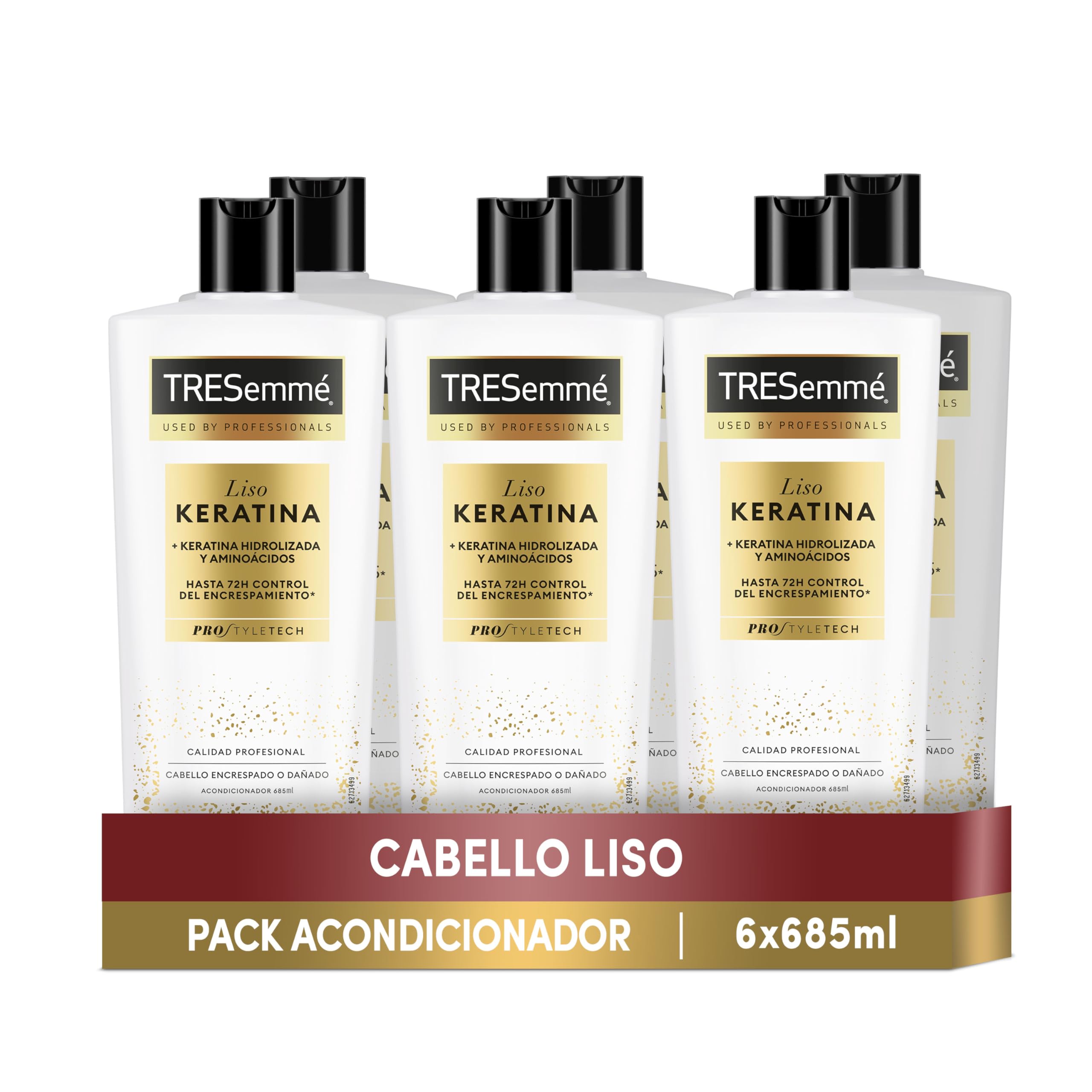 The Keratin Smoothing Conditioner combines Marula oil and keratin in one system with five benefits. This system controls frizz for up to 72 hours for softer, shinier, and nourished hair. Five benefits, one system: up to 72-hour frizz control, easy detangling, nourishment, softness, and dazzling shine. It is also suitable after a salon smoothing treatment. Use after shampooing. Apply evenly to wet hair from mid-lengths to ends. Leave on for 2 to 3 minutes and rinse thoroughly. The conditioner comes in a 100 recyclable plastic bottle and is a family-size product. To preserve the product, store it in a cool, dry place. Once opened, use within 12 months. Looking for the best version of yourself every day? At TRESemmé, we understand how your hair gives you the confidence to conquer the world. Because we want you to look your best, to feel empowered to shine. TRESemmé knows that fantastic hair gives you the confidence to hold your head high every day. Straight, curly, or wavy hair. Whatever your hair needs, we have the solution to help you achieve the best results with our professional-quality products. Ready to shine? The information displayed on the website may differ from the information on the product label. Always check the product label. TRESemmé Keratin Smoothing Shampoo and Conditioner. Consumer test. DIRECTIONS FOR USE Apply evenly to wet hair from mid-lengths to ends. Leave on for 2-3 minutes and rinse thoroughly.TRESemmé does not test on animals. Conditioner for dry and frizzy hair. 100 recyclable bottle. Easy detangling and styling. Softer, shinier, and nourished hair. Professional-quality conditioner that helps control frizz for up to 72 hours. Conditioner formulated with marula oil and keratin.TRESemmé Après-shampoing lisse à la kératine pour cheveux crépus ou abîmés à l'huile de marula et à la kératine - Lot de 6 x 685 mlDESCRIPTION DU PRODUIT DESCRIPTION DU PRODUIT L'après-shampoing lisse kératine combine l'huile de Marula et la kératine en 1 système avec 5 bienfaits. Ce système contrôle les frisottis jusqu'à 72 heures pour des cheveux plus doux, brillants et nourris. 5 avantages, 1 système : contrôle des frisottis jusqu'à 72 h, démêlage facile, nutrition, douceur et brillance éblouissante. En outre, il convient après avoir fait un traitement de lissage chez le coiffeur. Utilisez après le shampooing. Appliquez uniformément sur les cheveux humides du milieu aux pointes. Laissez agir pendant 2 à 3 minutes et rincez abondamment. L'après-shampooing est fabriqué avec une bouteille en plastique 100 recyclable et au format familial. Pour conserver le produit, conservez-le dans un endroit frais et sec. Après ouverture, utiliser dans les 12 mois. Vous cherchez la meilleure version de vous-même tous les jours ? Chez TRESemmé nous comprenons à quel point vos cheveux vous donnent confiance pour conquérir le monde. Parce que nous voulons que vous soyez à votre meilleur, pour vous sentir capable de briller. TRESemmé sait que des cheveux fantastiques vous donnent confiance pour aller avec la tête haute tous les jours. Cheveux lisses, bouclés ou ondulés. Quels que soient les besoins de vos cheveux, nous avons la solution pour que vous obteniez le meilleur résultat grâce à nos produits de qualité professionnelle. Prêt à briller ? Les informations affichées sur le site Web peuvent différer des informations figurant sur l'étiquetage du produit. Vérifiez toujours l'étiquetage du produit. Shampoing et après-shampoing lisse à la kératine TRESemmé. Test consommateur. MODE D'EMPLOI Appliquez uniformément sur cheveux humides du milieu aux pointes. Laisser agir 2-3 minutes et rincer abondamment.Globalement TRESemmé ne teste pas sur les animaux. Après-shampoing pour cheveux secs et à tendance à frisottis. Flacon 100 recyclable. Démêlage facile et finition de coiffure. Cheveux plus doux, brillants et nourris. Après-shampoing de qualité professionnelle qui aide au contrôle des frisottis jusqu'à 72 h. Après-shampoing formulé avec de l'huile de marula et de la kératine.