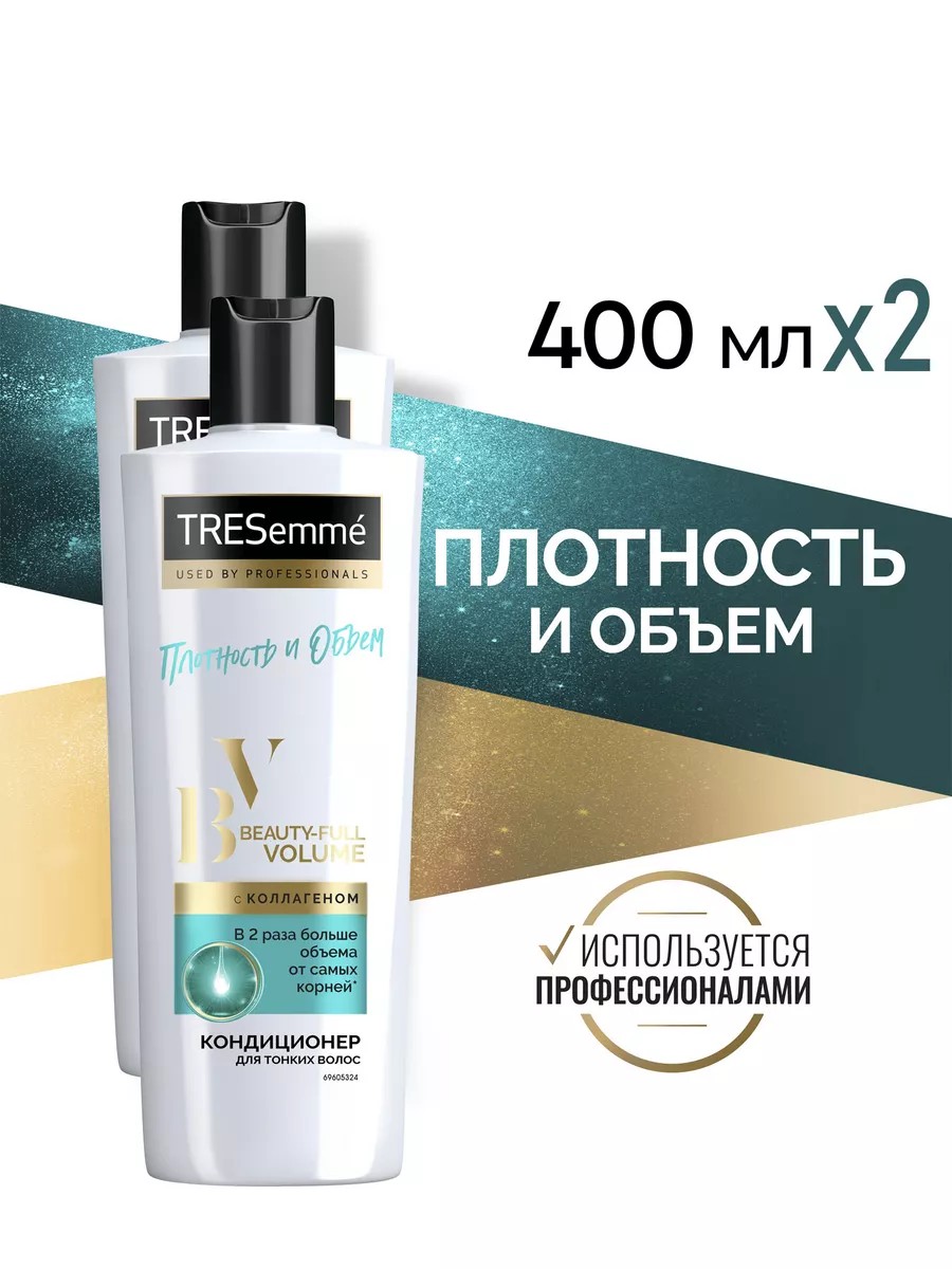 Кондиционер для тонких волос Tresemme Превосходный Объем. В наборе 2 штуки по 400 мл. Средство с уникальным сочетанием мицеллярной технологии и коллагена мягко ухаживает и придает объем от самых корней. Содержит в составе активные компоненты: