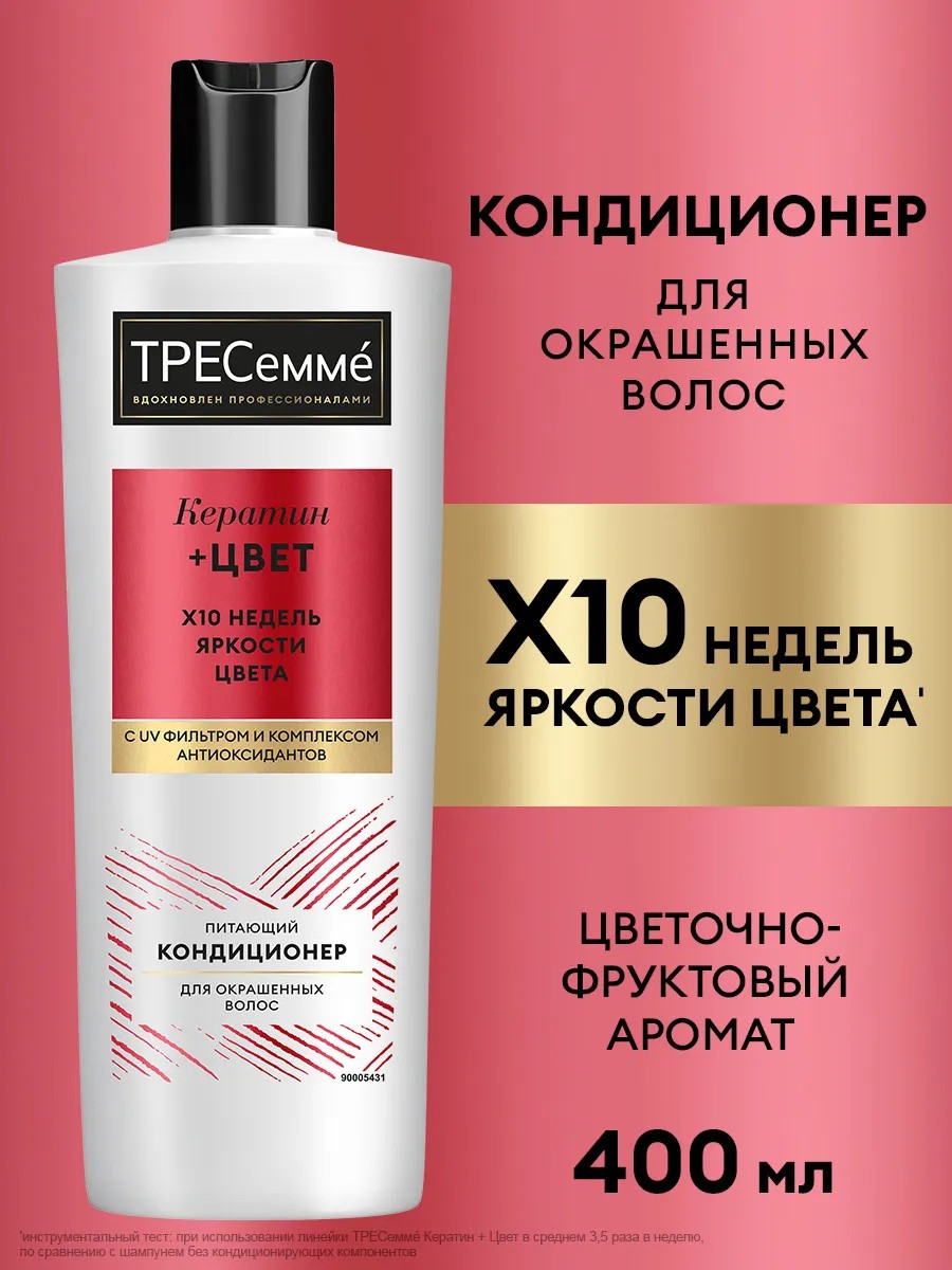 ТРЕСеммé Кератин + Цвет — кондиционер для окрашенных волос, вдохновленный профессиональными уходовыми средствами. Питающий кондиционер для волос женский с UV фильтром и комплексом антиоксидантов’ дарит видимый результат — X10 недель яркости цвета’’! Верните жизнь окрашенным локонам вместе с уходом за волосами от ТРЕСеммé: 1. Особая формула’’’ кондиционера запечатывает волос в невидимый защитный слой, который позволяет сохранить яркий, живой оттенок. 2. Средство облегчает расчесывание, сглаживает неровности и делает волосы послушными. 3. Кондиционер для волос окрашенных оказывает питающее действие, придает мягкость и блеск. Уход для волос из коллекции Кератин + Цвет оптимально подходит для окрашенных волос, которые потеряли жизненную силу и выглядят тусклыми. Также кондиционер подарит дополнительное питание для нормальных волос, склонных к спутыванию и ломкости. Способ применения. Нанесите на вымытые влажные волосы, смойте. При попадании в глаза тщательно промойте их водой. Для максимального блеска волос используйте кондиционер в комплексе с другими продуктами из коллекции Кератин + Цвет: шампунем и питающей маской. От создания безупречного образа вас отделяет всего три шага: 1. Шампунь ТРЕСеммé Кератин + Цвет эффективно очистит волосы и кожу головы от излишков себума и загрязнений. 2. Кондиционер напитает волосы и сделает локоны более послушными. 3. Маска обеспечит интенсивное восстановление окрашенных волос, придаст блеск и неповторимую мягкость. В 1948 году в салонах красоты Нью-Йорка был создан ТРЕСеммé – бренд, позволяющий женщинам выглядеть и чувствовать себя уверенно. И все благодаря прическе! ТРЕСеммé вдохновляется профессиональными салонными разработками и предлагает эффективные решения для роскошных волос.