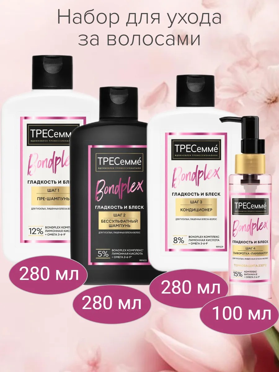 Линейка средств ТРЕСеммé Bondplex Гладкость и блеск предназначен для ухода за тусклыми волосами, лишенными блеска для восстановления и укрепления пористых и поврежденных волос у женщин и девушек. Пре-шампунь для предварительного ухода проникает в кутикулу волоса и защищает его от воздействия жесткой воды, потери блеска и ломкости во время мытья головы. Продукт позволяет классическому шампуню действовать более бережно, предотвращая повреждения волос по всей длине. Увлажняющий шампунь без сульфатов для мытья волос бережно очищает кожу головы, увлажняет сухие пряди, снижает пушистость и облегчает расчесывание. Средство борется с ломкостью, секущимися кончиками и тусклым видом, наполняя волосы сиянием. Восстанавливающий бальзам - ополаскиватель с эффектом ламинирования возвращает локонам природную красоту благодаря молекулярному восстановлению и укреплению структуры волос. Сыворотка с с эффектом ламинирования - антистатик для волос от электризации подходит эффективен против пушистости. Делает волосы более послушными в момент укладки и расчесывания. Формула средств обогащена комплексом Bondplex с лимонной кислотой и омега 3-6-9 в составе. Благодаря формуле с этими компонентами волосы становятся гладкими и блестящими уже после первого применения. Пряди приобретают эффект ламинирования за 1 применение. А также гладкость без спутывания и стойкий блеск на 72 часа. Бессульфатная формула обеспечивает мягкое очищение, сохраняет баланс кожи головы и яркость цвета волос. Ваши локоны выглядят так, словно вы только что вышли из салона красоты!