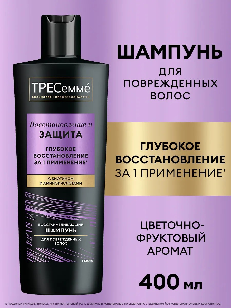 "ТРЕСеммé Восстановление и Защита — шампунь восстанавливающий для волос, обогащенный биотином и аминокислотами. Шампунь оказывает помощь для безжизненных волос: