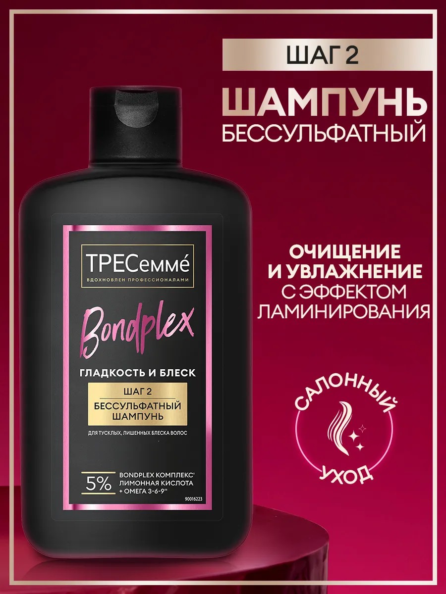 Бессульфатный шампунь для волос ТРЕСеммé Bondplex Гладкость и блеск - это средство для ухода за тусклыми и лишенными блеска волосами. Косметический уходовый продукт разработан для увлажнения, восстановления и укрепления поврежденных волос у женщин и девушек.