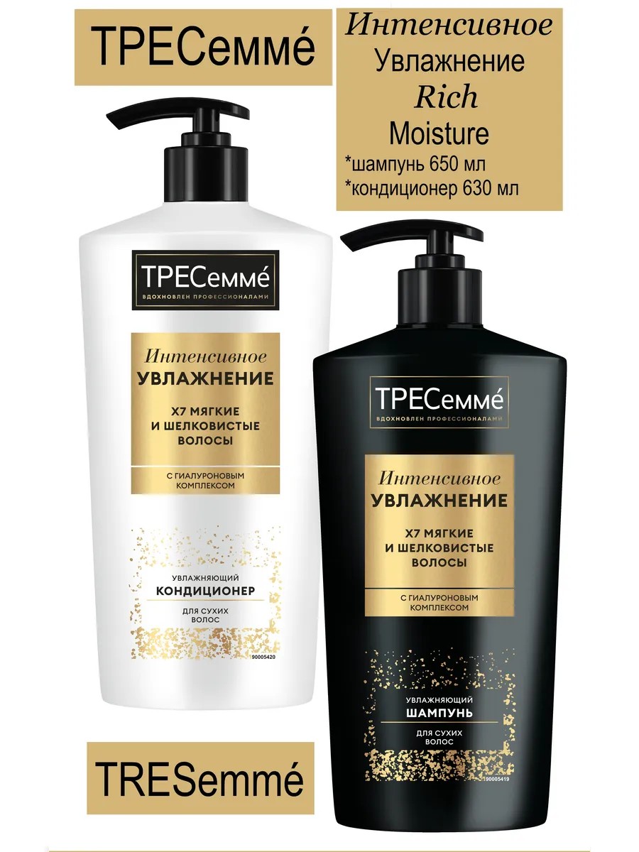 | Комплектация | ТРЕСеммé Интенсивное Увлажнение шампунь увлажняющий для сухих волос 650 мл; ТРЕСеммé Интенсивное Увлажнение кондиционер увлажняющий для сухих волос 630 мл |