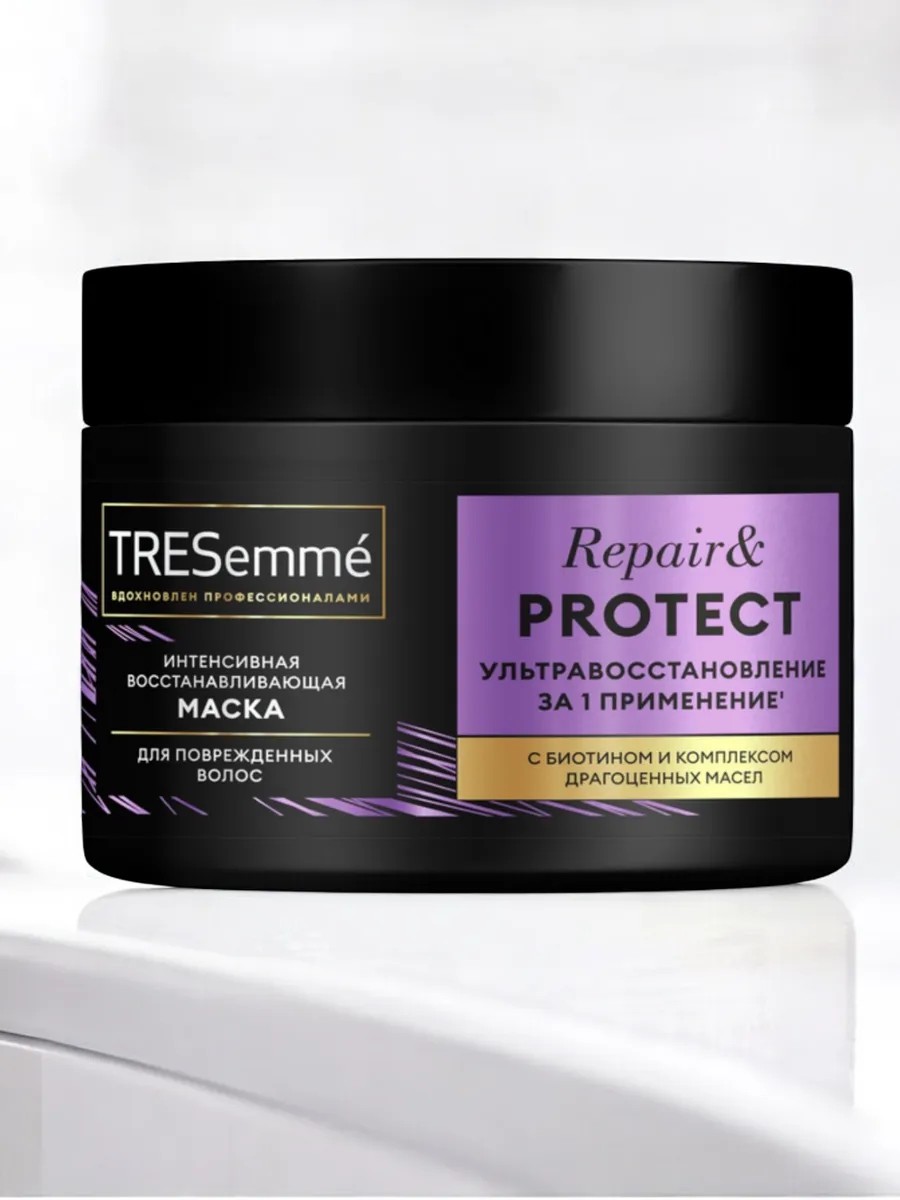 TRESemmé Repair&PROTECT — интенсивная восстанавливающая маска для поврежденных и сухих волос, вдохновленная профессиональными уходовыми средствами. Маска для волос с биотином и комплексом драгоценных масел макадамии и ши дарит видимый результат — ультравосстановление за одно применение’! Особая формула’’ маски для сухих и поврежденных волос значительно сокращает ломкость’ и уменьшает количество секущихся кончиков. Уход за волосами с восстанавливающей маской сделает пряди мягкими и блестящими. 'ультравосстановление в линейке продукции бренда TRESemmé, инструментальный тест Unilever: при совместном использовании с шампунем TRESemmé Repair&Protect по сравнению с шампунем без кондиционирующих компонентов. ‘’в линейке продукции бренда TRESemme.