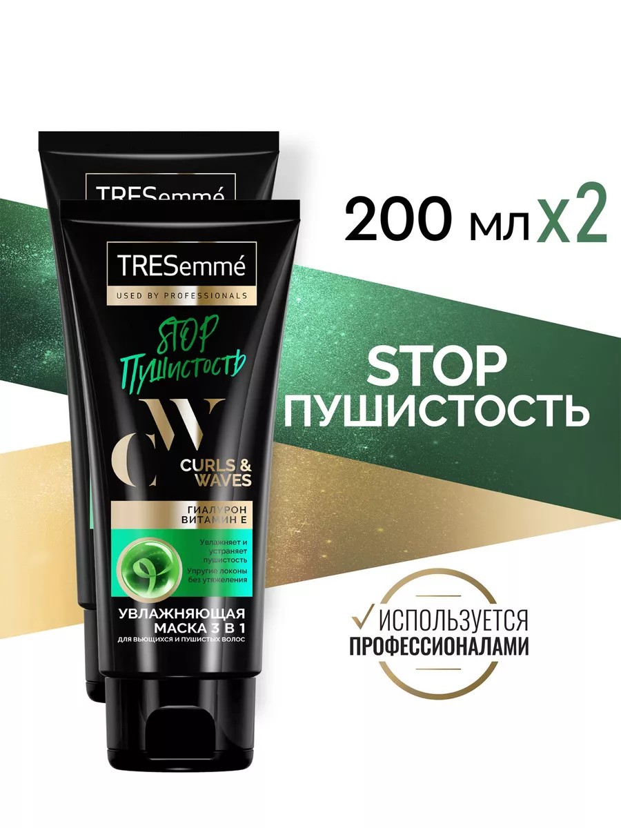 Маска для кудрявых и пушистых волос Tresemme Локоны и Волны. В наборе 2 штуки по 200 мл. Работает сразу в трех направлениях: как кондиционер, маска и несмываемый уход. Обеспечивает глубокое увлажнение, оставляет ощущение мягкости и придает блеск. Формула обогащена ухаживающими ингредиентами: