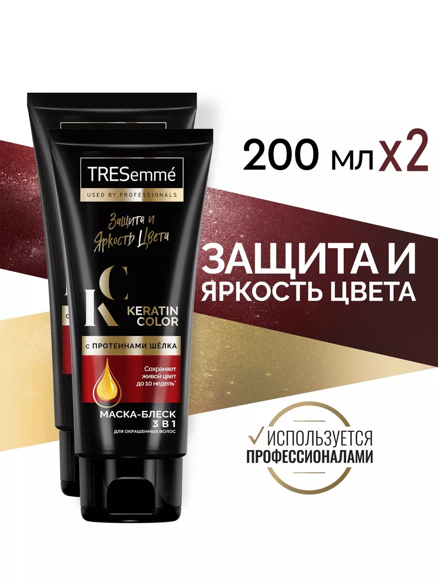 Tresemme Keratin + Color Mask for highlighted and colored hair. The set contains 2 pieces of 200 ml. Can be used as three products at once: mask, conditioner, and leave-in treatment.