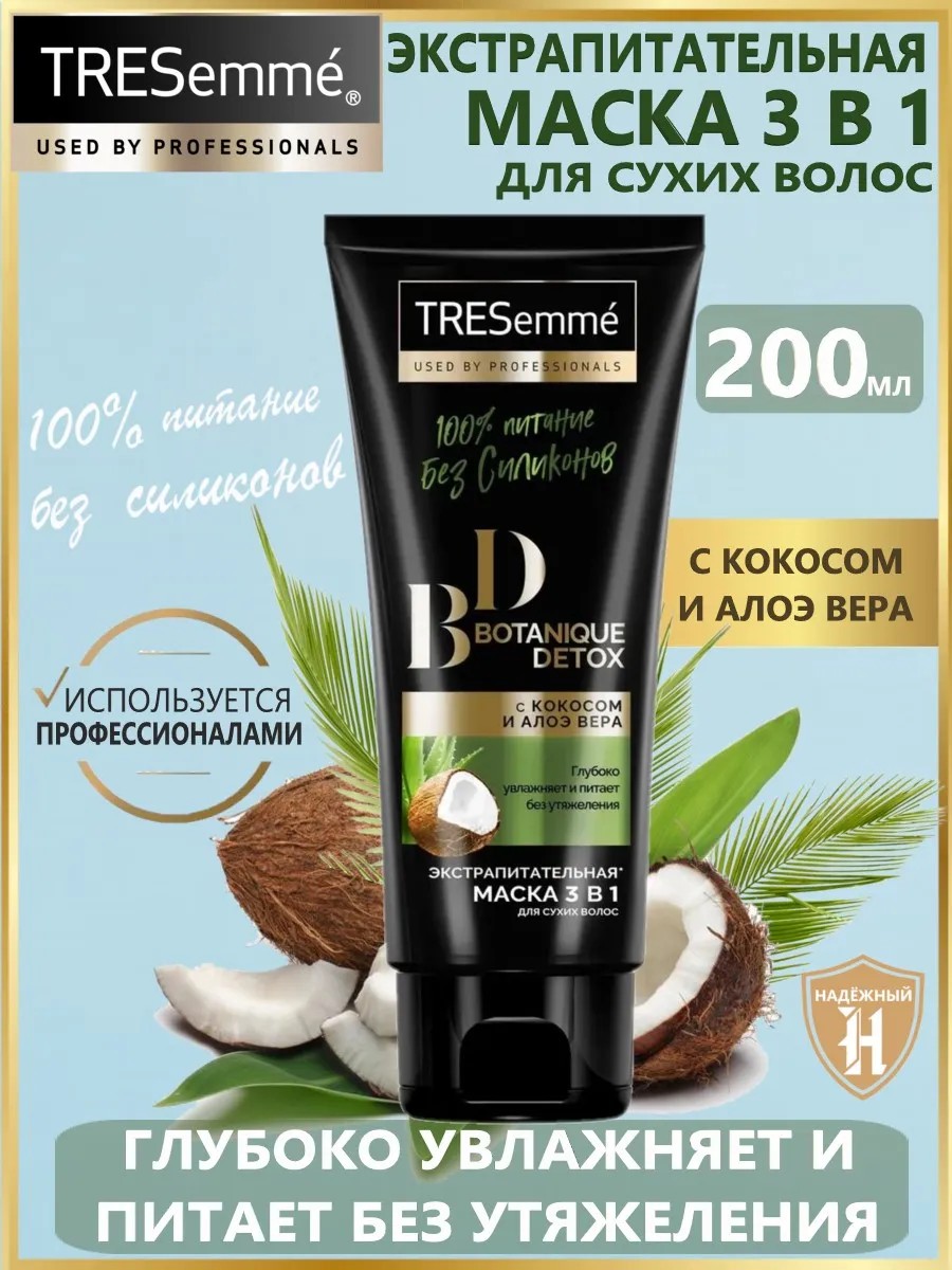 Любые волосы периодически нуждаются в питании и увлажнении. Если в твоих планах иметь гладкие и мягкие волосы – добавь в свой постоянный уход экстрапитательную* маску TRESemmé Botanique Detox. Она вдохновлена самой природой! Без силиконов, парабенов и красителей. Формула с кокосом и алоэ вера увлажняет волосы и наполняет питательными компонентами. Смягчает и разглаживает волосы без утяжеления. Может быть использована сразу как три средства: маска для волос, кондиционер, несмываемый уход.Результат: мягкие и блестящие волосы без утяжеления!*В линейке продукции бренда TRESemmé.Состав продукта:Aqua, Cetearyl Alcohol, Stearamidopropyl Dimethylamine, Cocos Nucifera (Coconut) Oil, Aloe Barbadensis Leaf Juice, Behentrimonium Chloride, Dipropylene Glycol, Disodium EDTA, Lactic Acid, Magnesium Nitrate, Methylchloroisothiazolinone, Methylisothiazolinone, Parfum, Sodium Chloride, Coumarin, Hexyl Cinnamal, Linalool.