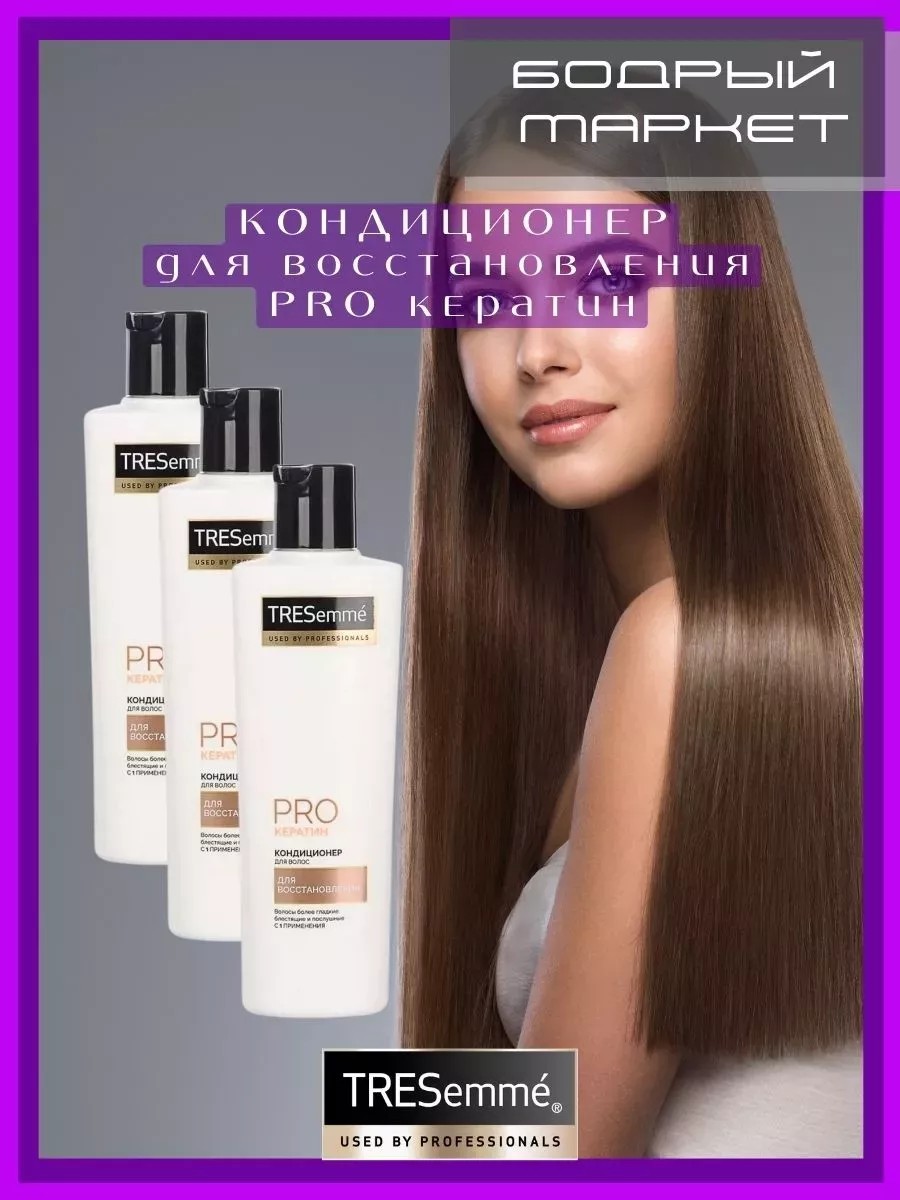 Комплект 3 шт. Если волосы стали ломкими и выглядят безжизненными, попробуй продукты из новой серии Pro Кератин от TRESemmé. Кондиционер Tresemme с кератином эффективно увлажняет и питает волосы после мытья. • Формула с кератином способствует восстановлению волос; • Придает волосам здоровый блеск и шелковистость; • Гладкие и послушные локоны уже с первого применения; • Подходит для регулярного использования. Всего два простых шага на пути к безупречному образу и ухоженным волосам. Начни с мытья волос шампунем для качественного и эффективного очищения. Далее для интенсивного ухода на чистые влажные волосы нанеси кондиционер. Шампунь и кондиционер представлены в объеме 200 мл, ими удобно пользоваться не только дома, но и брать с собой в зал или поездку. Попробуй также серию Pro Биотин для яркости цвета и Pro Коллаген для густоты и объема. Профессионалы уверены: каждая укладка зависит от качества волос. TRESemmé – профессиональная основа для создания любого образа. Бренд следует современной концепции в уходе за собой Do it yourself (сделай сама): ты больше не зависишь от стилистов и визажистов! Ведь каждая девушка знает, что подойдет именно ей. Если у тебя под рукой есть качественные средства по уходу и советы от TRESemmé, ты самостоятельно сможешь создать идеальный образ. Пользуйся средствами для волос TRESemmé и восхищай красивыми и ухоженными волосами.