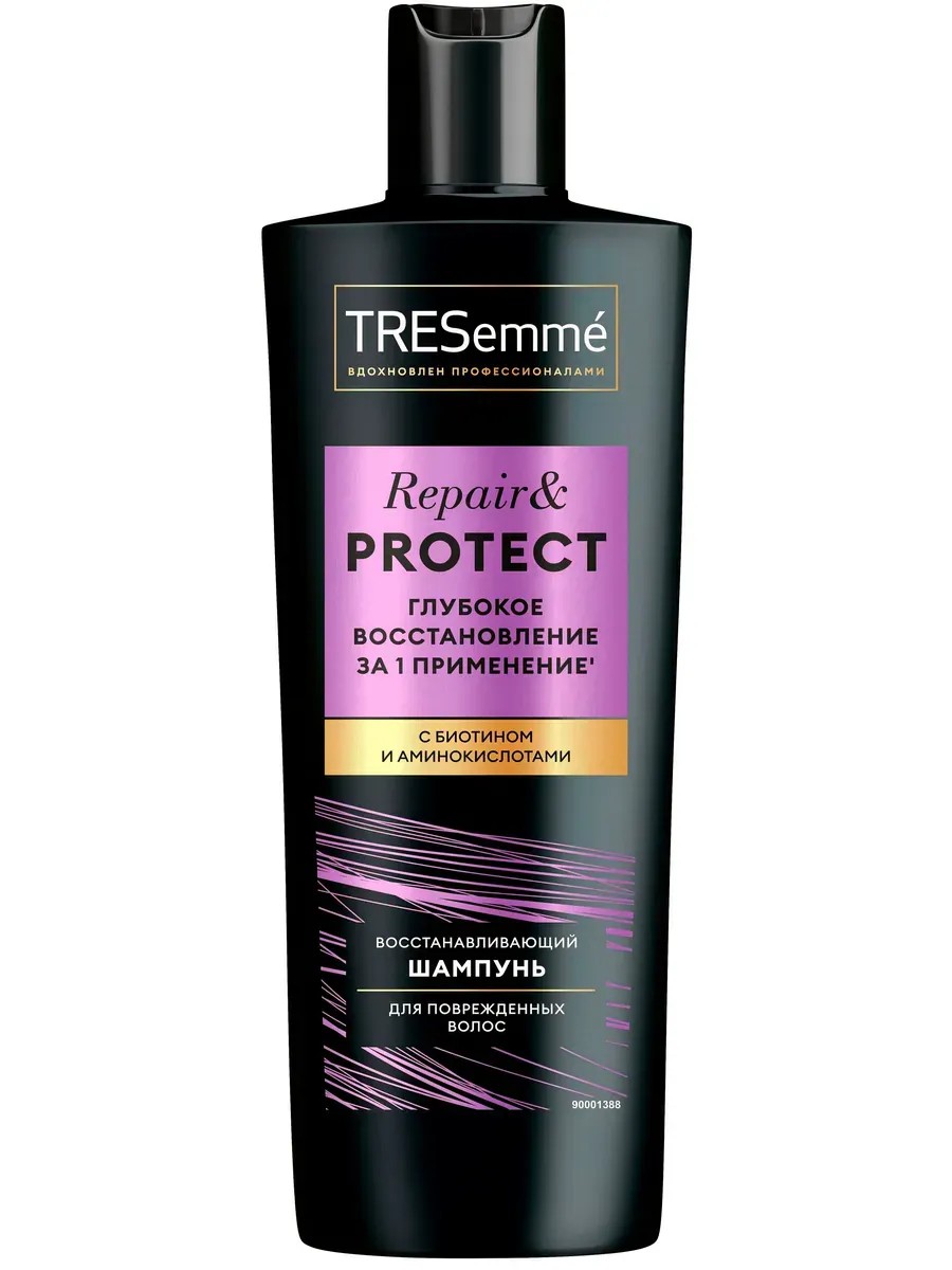TRESemm Repair Protect Shampoo for Damaged Hair, Restorative, 400 ml TRESemm Repair Protect is a restorative shampoo for damaged hair, enriched with biotin and amino acids. This shampoo helps lifeless hair and works in several ways: - This women's shampoo transforms brittle and thinning hair in one use; - A special formula with biotin and amino acids for hair works with each hair, restoring and nourishing it from the inside, and provides visible results even after severe damage; - This shampoo for damaged hair significantly reduces split ends. TRESemm Repair Protect Shampoo with biotin and amino acids is ideal for dry hair that has lost its vitality due to frequent blow-drying and coloring. This shampoo for brittle hair can also be used to provide additional nutrition to normal curls.