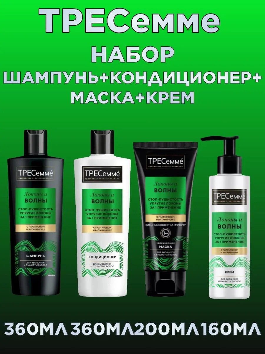 Набор TRESemmé Локоны и Волны создан с учетом всех потребностей кудрявых и волнистых волос, склонных к сухости, пушистости и спутыванию. Комплекс из шампуня, бальзама, маски и несмываемого крема обеспечивает бережное очищение, глубокое увлажнение и контроль над завитком, помогая добиться профессионального результата в домашних условиях.